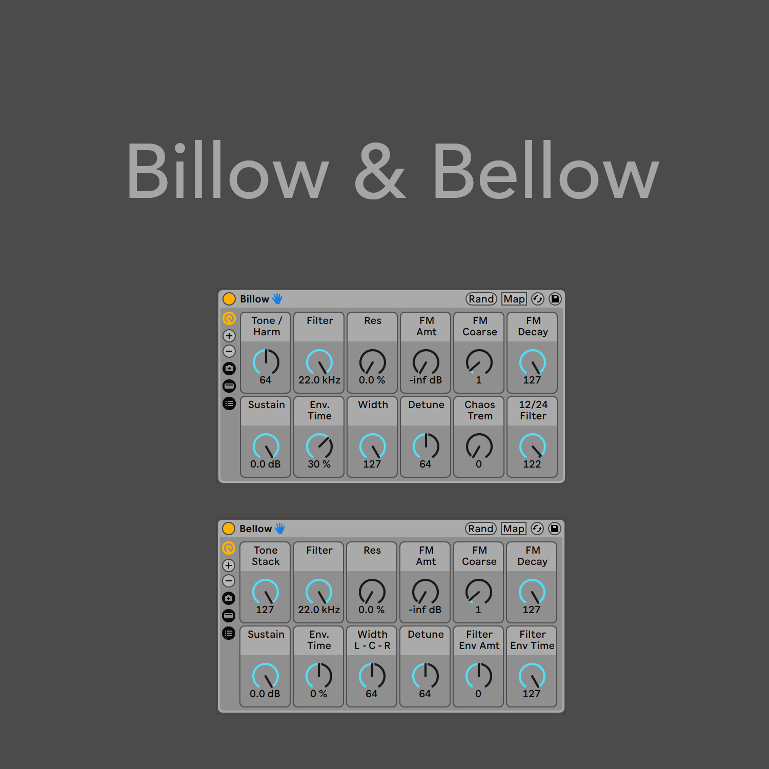 Billow & Bellow are instrument racks based on 4 looping samples. The racks use Ableton's Sampler and make use of it's FM oscillator to produce very natural sounds but with the option of a very digital layer over top. Billow is very undulating, good for modulated pads and soundscapes. Bellow can be punchier with more attack and less wavering to the sound.