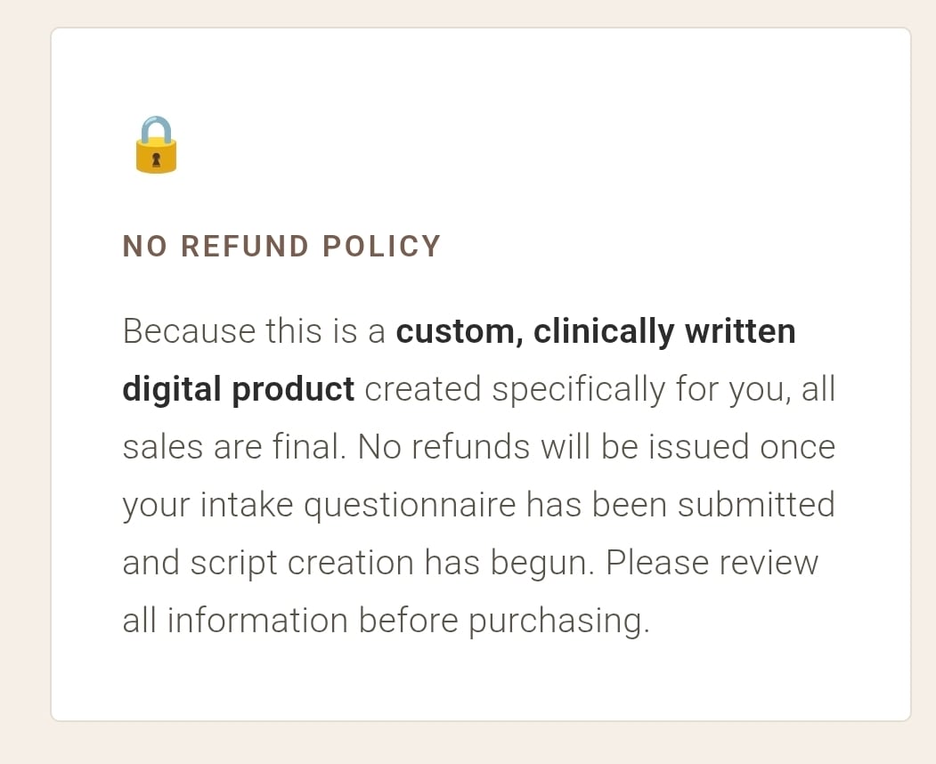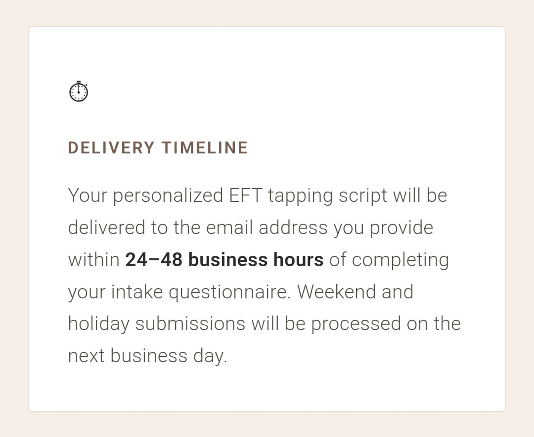 Your personalized script will be delivered to your email within 24–48 business hours of completing your questionnaire.