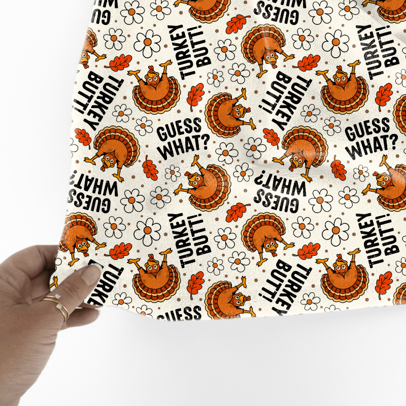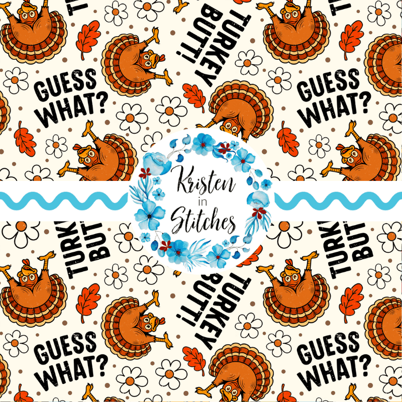 A sarcastic Thanksgiving pattern featuring turkey butts and flowers on ivory.