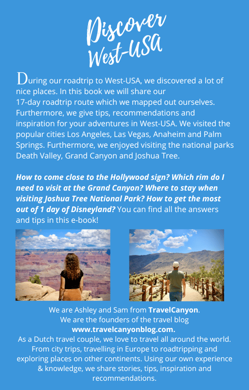 32 pages - During our roadtrip to West-USA, we discovered a lot of nice places. In this book we will share our 17-day roadtrip route which we mapped out ourselves. Furthermore, we give tips, recommendations and inspiration for your adventures in West-USA. We visited the popular cities Los Angeles, Las Vegas, Anaheim and Palm Springs. Furthermore, we enjoyed visiting the national parks Death Valley, Grand Canyon and Joshua Tree.