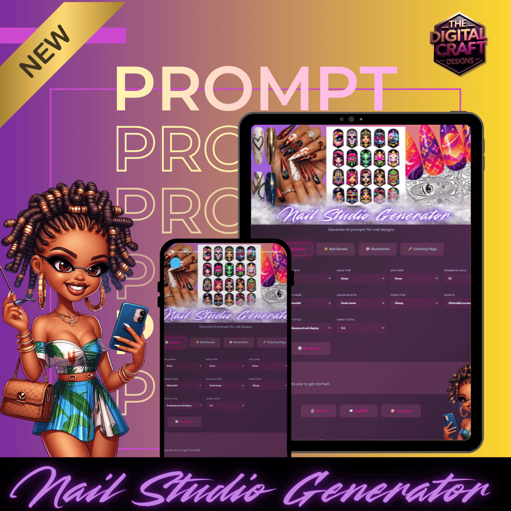 A digital Nail Studio Prompt Generator designed to help you create endless nail design prompts for AI art tools.