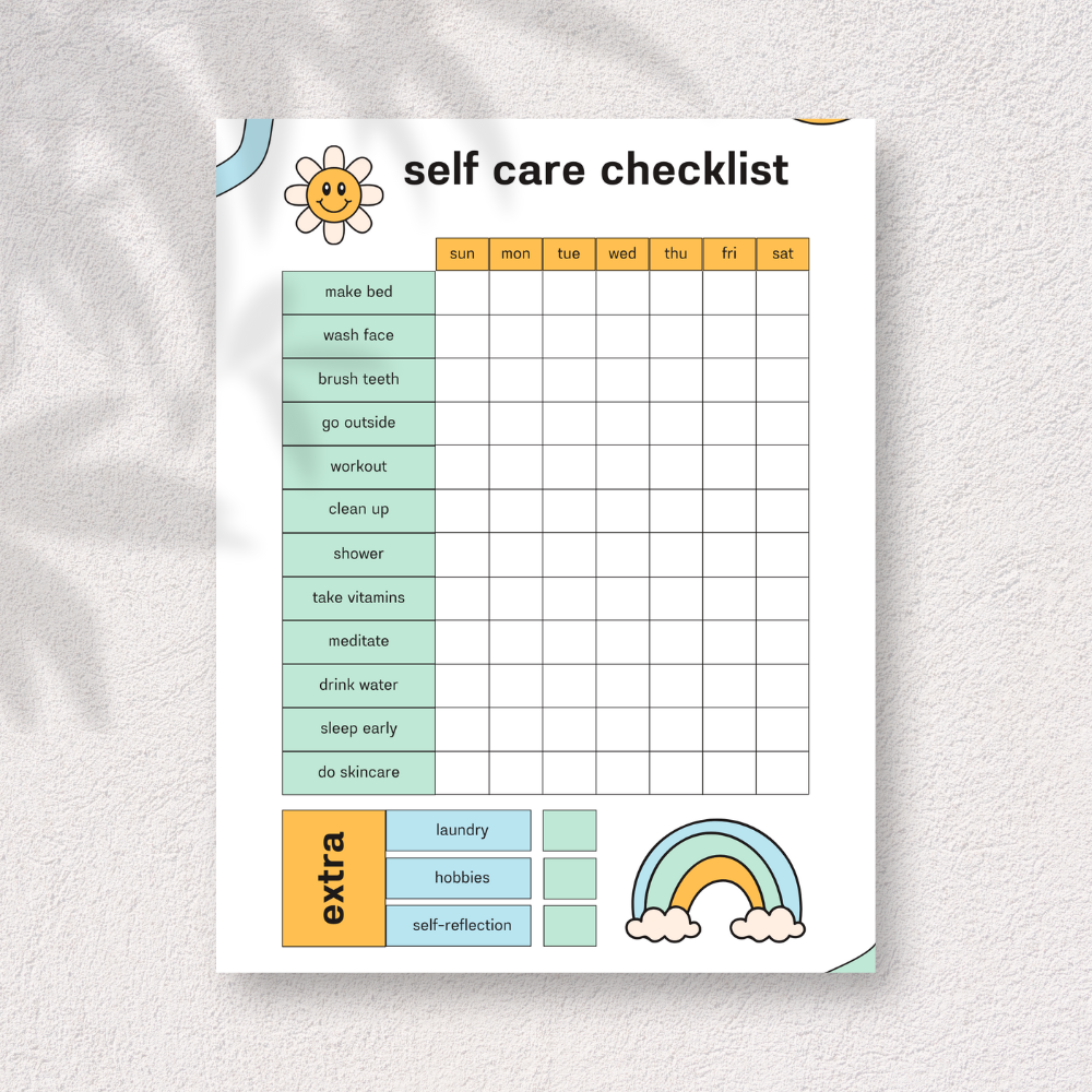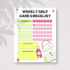 a colorful and eye-catching designs that encourages you to make self-care a daily habit. The checklists includes a variety of self-care activities, from physical exercise to mindfulness practices, and provides space for you to track your progress each day.
