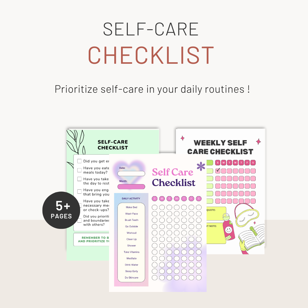 - A printable PDF file include 5 colorful and eye-catching designs of self care checklists.