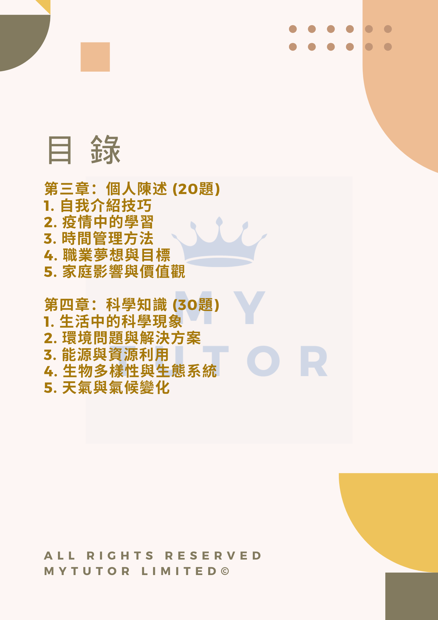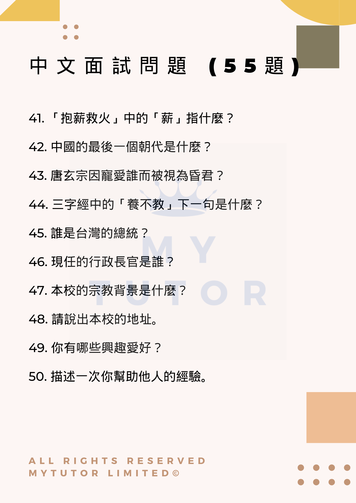 - 合共200題中學面試題目,包含中文面試題目、英文面試題目、數學題目、科學題目、小組討論題目等等