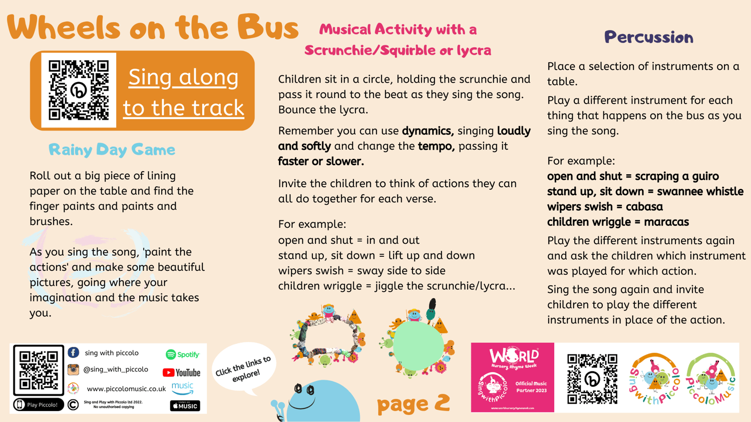 Download Piccolo's Musical Activities for 'The Wheels On The Bus' one of the featured rhymes of World Nursery Rhyme Week 2023. There's so many fun ways you can sing this song! How about as a Knee bouncer? Or with Puppets? Or have a go at Piccolo's 'Sing and Draw' activity! You can find Piccolo's ideas for getting the most fun out of this track in these musical activity sheets!