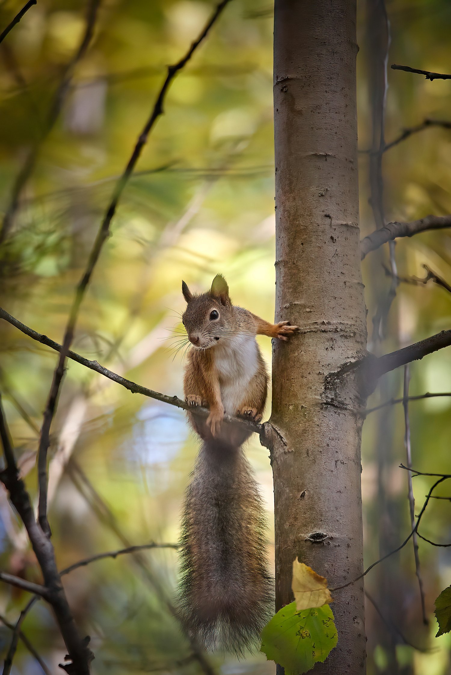 Squirrel (sciurus vulgaris) sitting on a branch, in the background autumn yellow leaves.