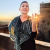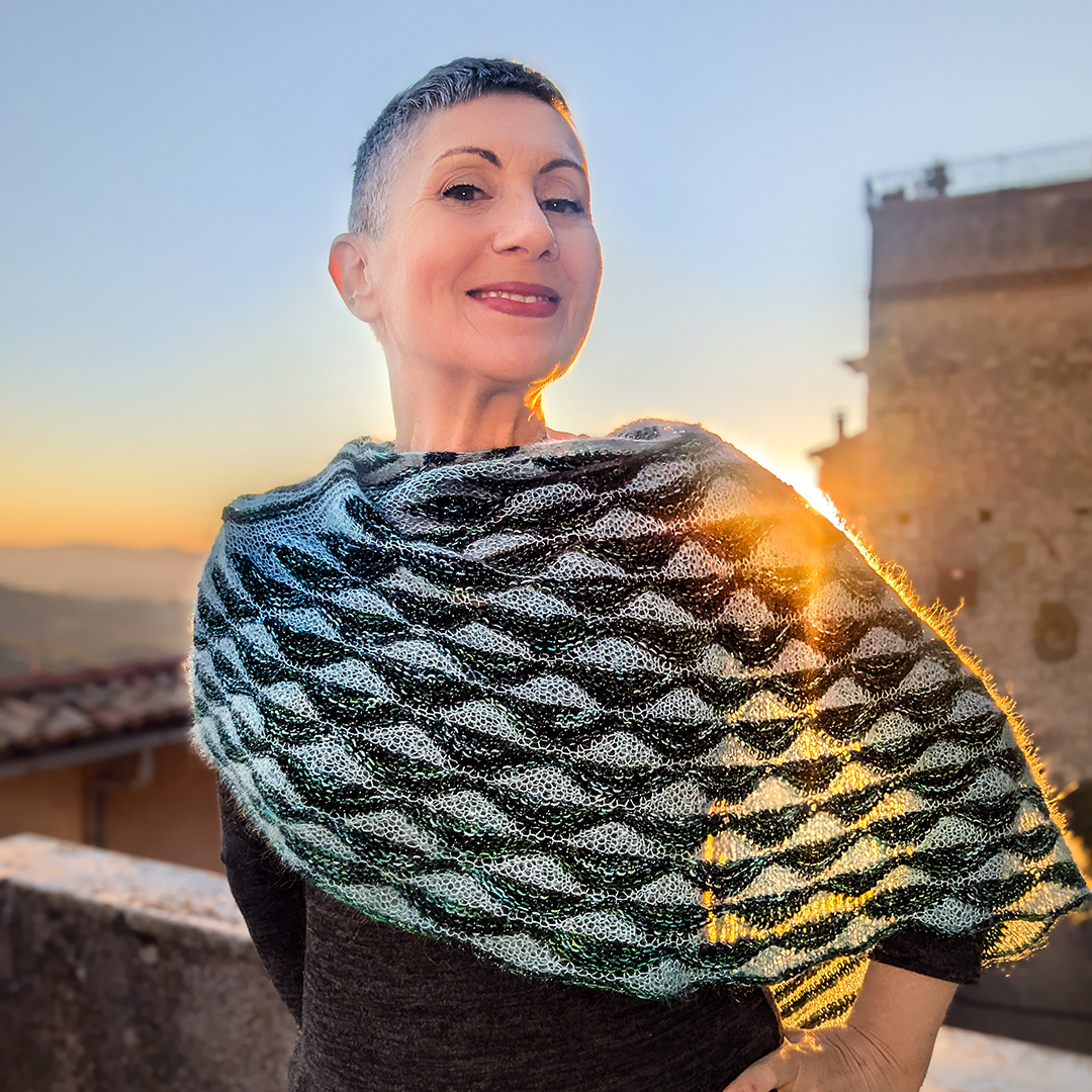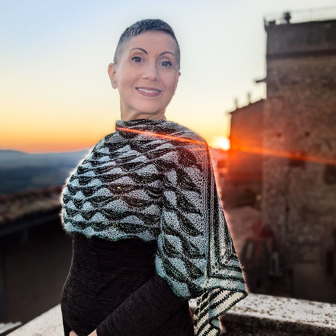This is a modular crescent shawl, worked seamlessly in 3 different pieces. First the two big lateral triangle modules/mountains are worked, then they are joined together with the main part of the shawl that is knitted using a short-row motif reminding of soft hills.