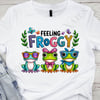 Get ready to leap into fun with this adorable "Feeling Froggy" t-shirt! This playful design features three charming cartoon frogs, each with their own unique personality and stylish accessories. One frog sports cool purple and orange sunglasses, another wears a cute pink polka-dot bow, and the third is rocking blue glasses and a matching bandana. The words "FEELING FROGGY" are playfully displayed above them in colorful, whimsical lettering, decorated with butterflies and leafy accents.