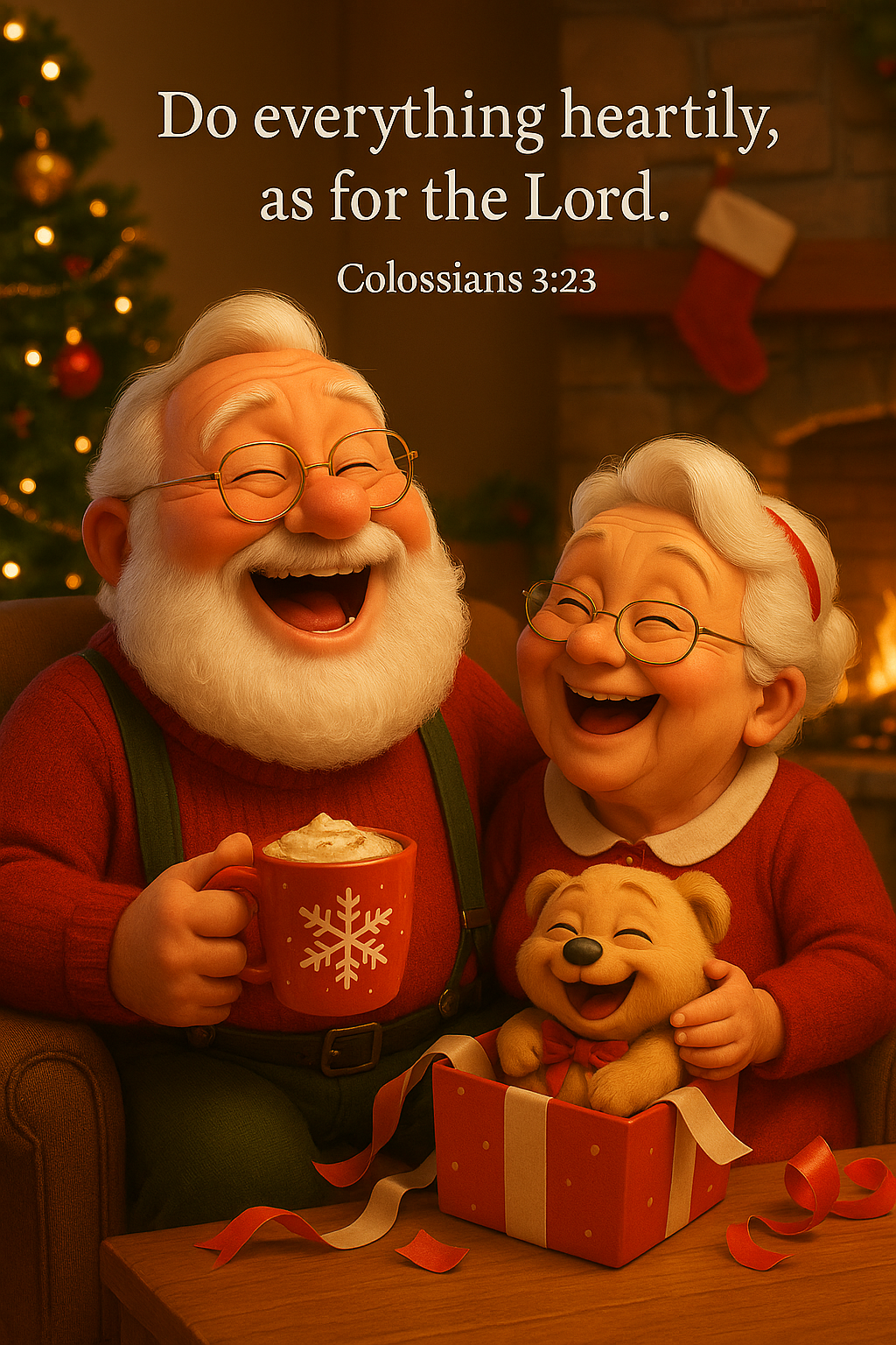 Celebrate cheerful giving and wholehearted love with this Christian wall art featuring Colossians 3:23. An elderly couple shares laughter and cocoa beside a festive Christmas tree and fireplace, with a plush bear nestled in a red gift box between them. This printable radiates warmth, joy, and purposeโperfect for Christmas scripture decor, ministry bundles, devotional gifts, and inspirational holiday printables.