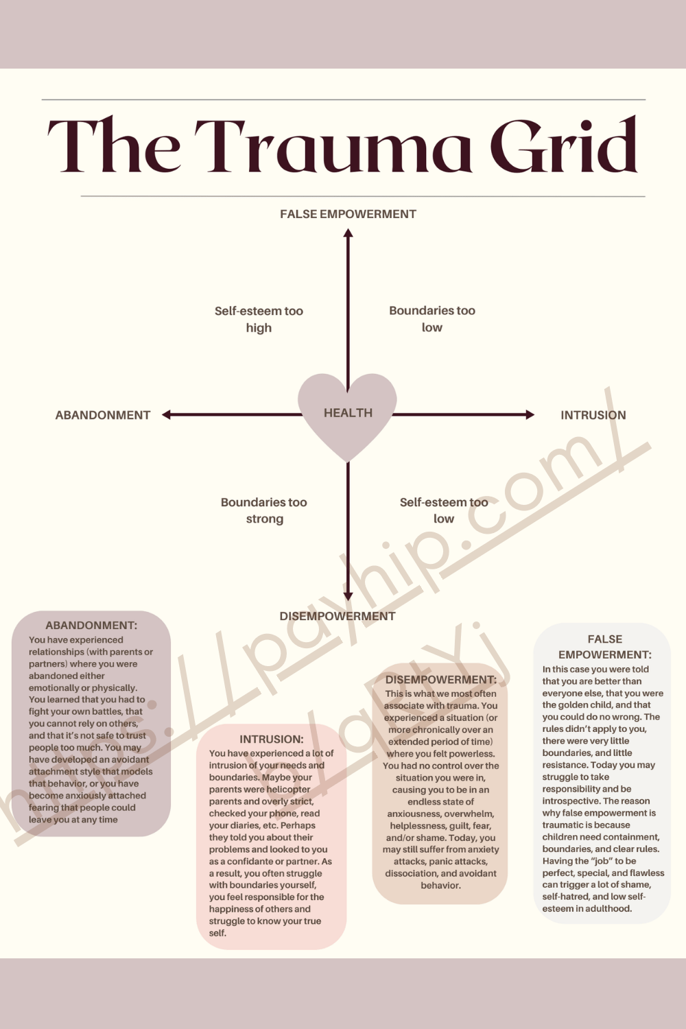The Trauma Grid provides a helpful framework on how childhood wounds and trauma, and the relationships we have with our initial caretakers can influence how we show up in adult relationships. The grids represent self-esteem on the Y axis and boundaries on the X axis. This can be a helpful tool in relational healing work, and understanding how your child ego states develop, and reappear in relationships throughout your life.