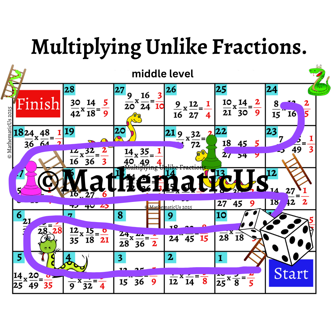 This fun dice board game helps students practice multiplying unlike fractions by simplifying fractions first. It’s an engaging way for children to review and reinforce fraction multiplication while having fun.