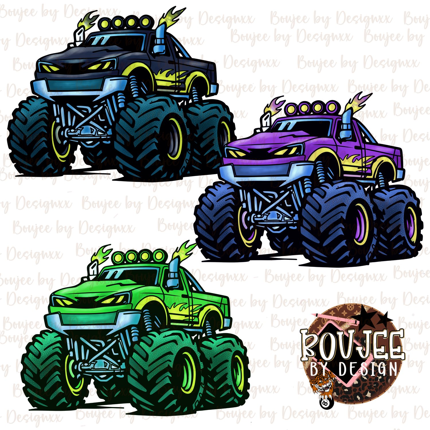 This bundle includes 5 high-quality monster truck designs, each in a different vibrant colorway. These are ready to use for sublimation, DTF, and other print projects.