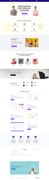 This dynamic and engaging website template is designed for businesses looking to enhance their marketing strategies through influencer partnerships. The template features a bold header inviting users to boost their business with influencer marketing, with a prominent call-to-action button for contacting the service.