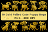 10 Gold Foiled Cute Puppy Dogs Graphic PNG files in size: 5000 x 5000 pixels in 300 DPI with transparent background.