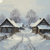 A quiet, rustic village scene rendered in thick oil paint captures a deep winter day. Two traditional, dark log cabins heavily dusted with snow frame a central winding path that leads the eye into a misty background of skeletal trees and distant houses. The painting features a cool, muted palette of whites, grays, and icy blues, accented by the warm browns of the wood and rooflines. The visible brushstrokes convey a sense of profound stillness and cold solitude.