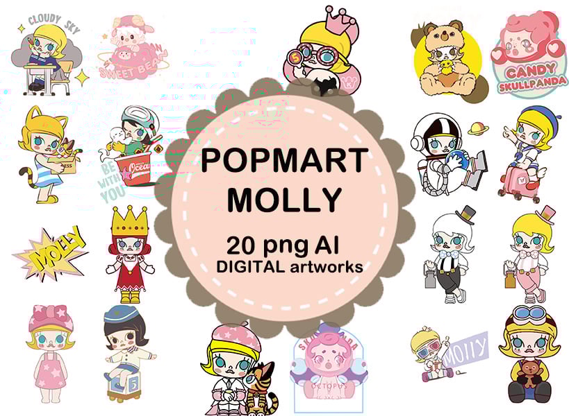Elevate your creative projects with this exclusive collection of 20 large PNG and Illustrator AI digital artworks inspired by the whimsical world of Popmart Molly! Perfect for artists, designers, and enthusiasts who love unique, high-quality digital assets.