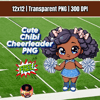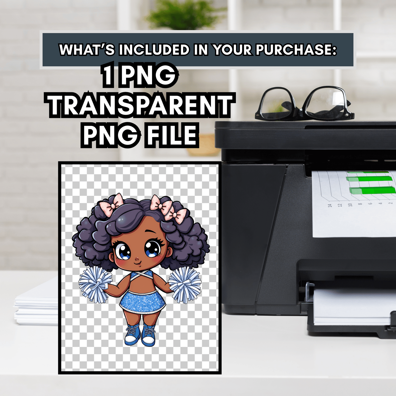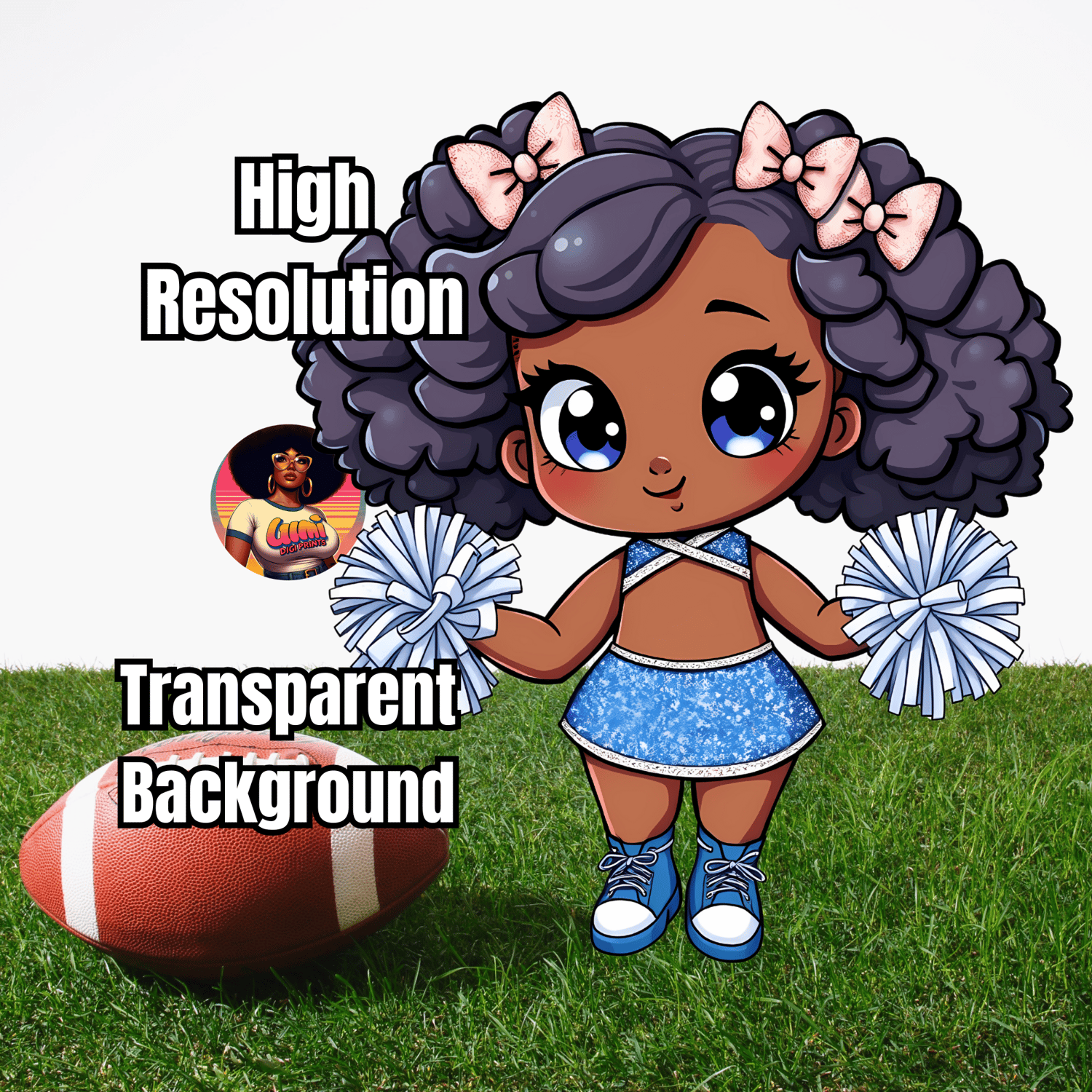 This charming character is ready to hit the field, featuring beautiful curly hair puffs adorned with pink bows, and a sparkling blue cheer uniform. Her energetic pose and bright eyes are sure to bring life and personality to any design. She's perfect for celebrating a local sports team, creating a special birthday gift, or just adding a dash of cuteness to your collection.