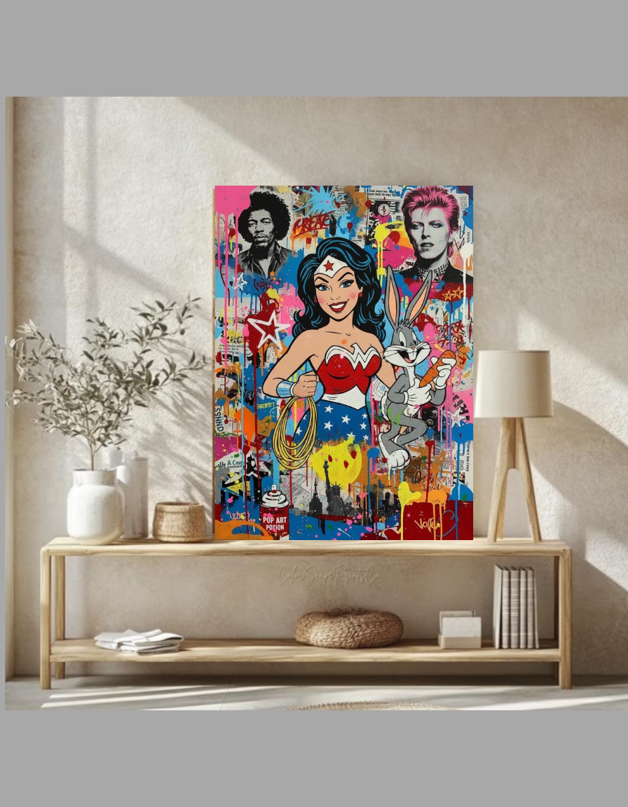 Elevate your space with this eye-catching pop art print featuring Wonder Woman teaming up with Bugs Bunny in a colorful street art style. Surrounded by graffiti drips, urban vibes, and portraits of music legends Jimi Hendrix and David Bowie, this downloadable digital artwork blends superhero comics, Looney Tunes fun, and rock iconography. Perfect for modern home decor, printable on canvas or poster – instant download for pop art enthusiasts searching for unique graffiti wall art, superhero posters, or celebrity mashup prints. High-resolution file ready for personal use.