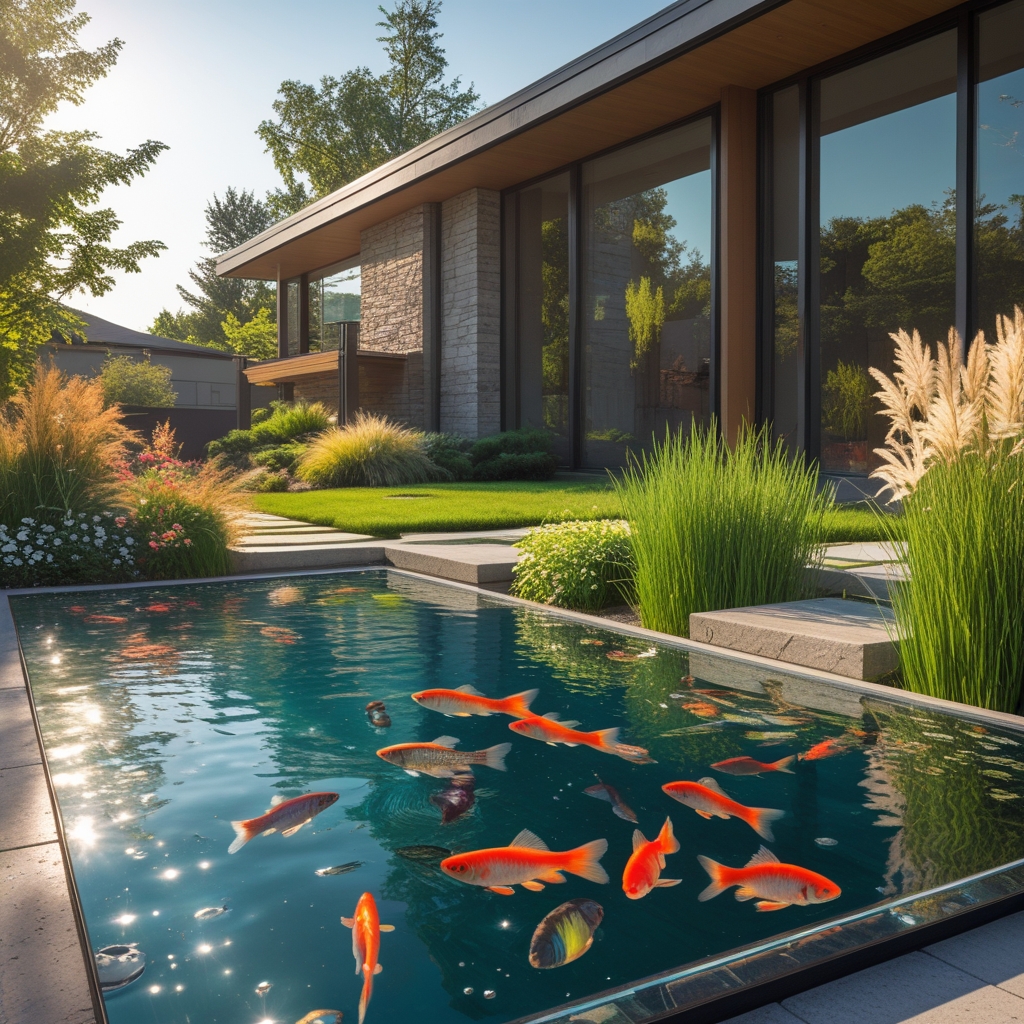 "Stunning large outdoor fish pond seamlessly integrated into a modern house, featuring a clear glass front panel that showcases colorful fish swimming inside. The pond is surrounded by beautifully landscaped greenery, including flowering plants, ornamental grasses, and smooth stone pathways. Natural sunlight reflects off the water, creating sparkling highlights. The house behind the pond has sleek modern architecture with large windows and wooden or stone accents. Tranquil and serene atmosphere, with high attention to realistic textures, reflections, and vibrant colors, cinematic angle emphasizing both the pond and its surroundings."