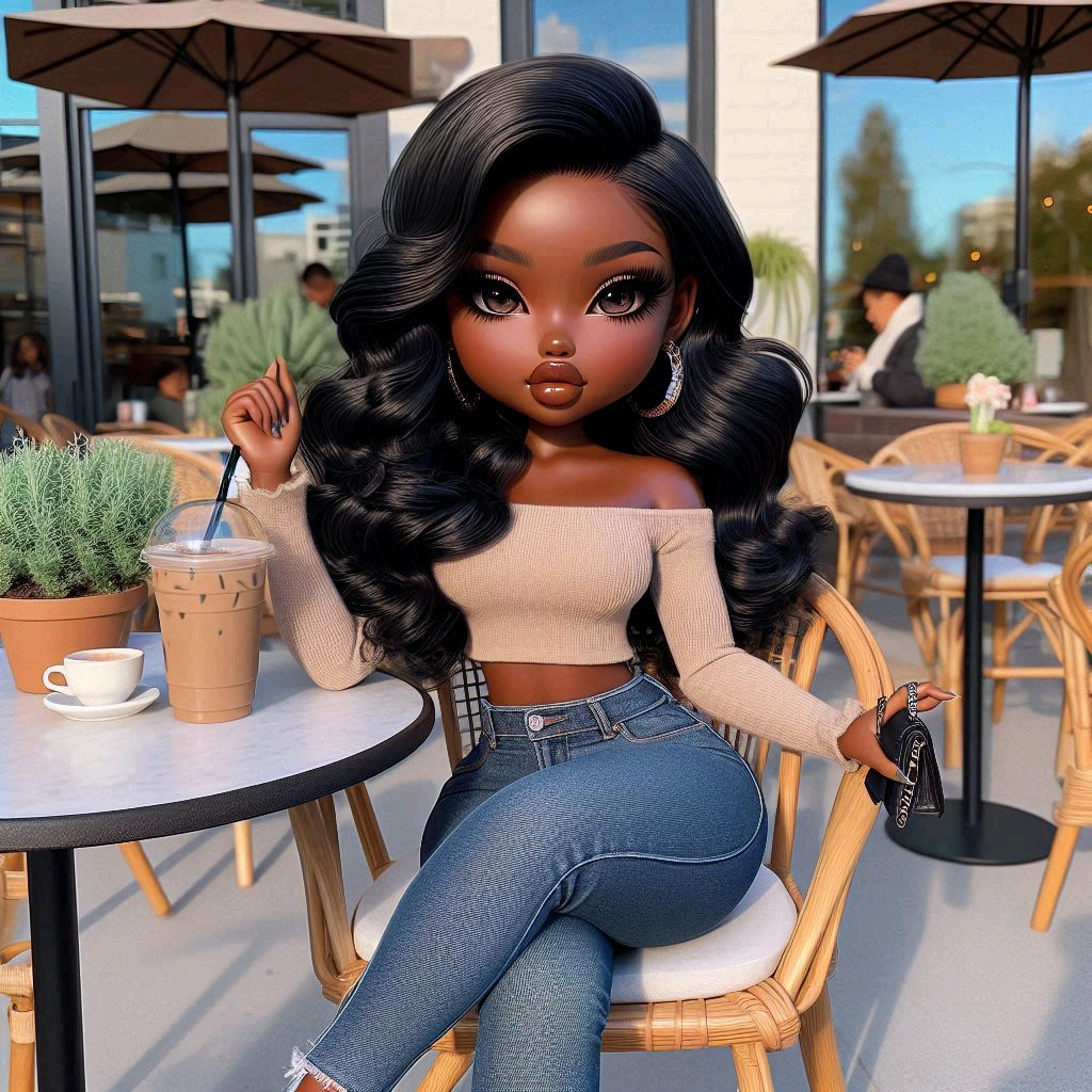 This luxury glam digital artwork features a confident boss babe enjoying her iced coffee moment in style. With flawless melanin skin, voluminous glossy waves, statement hoop earrings, a chic off-shoulder top, and perfectly fitted jeans, she radiates soft luxury and modern feminine power.