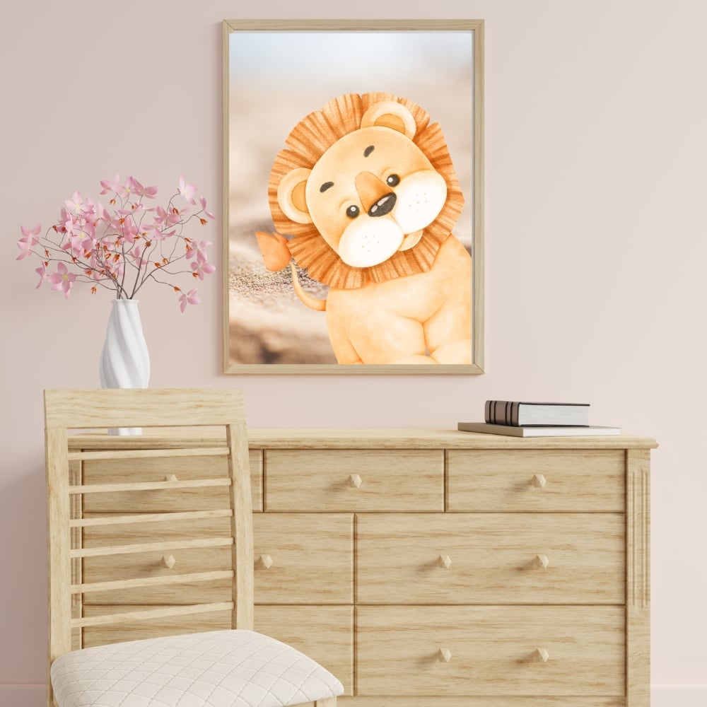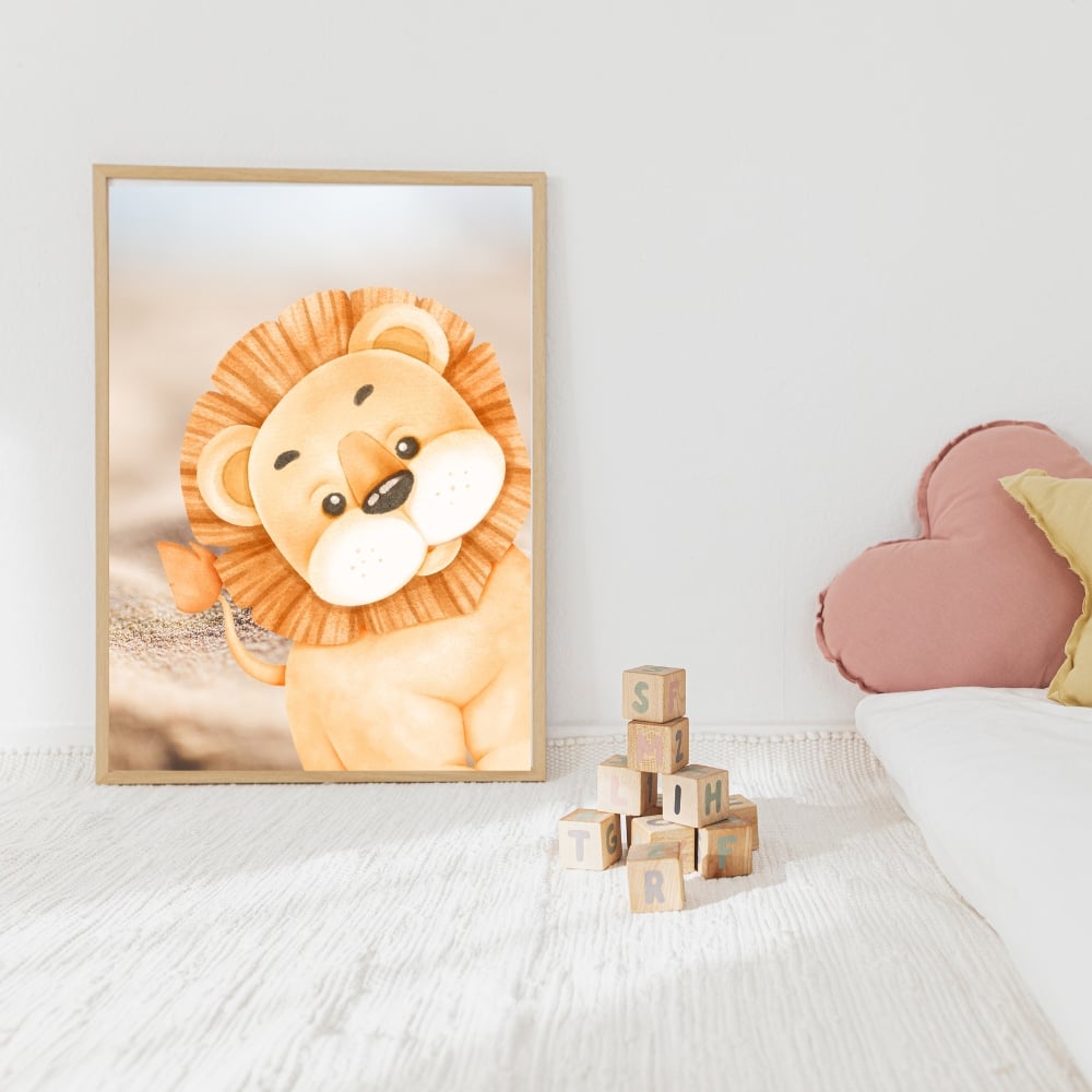 Agrega un toque de suave ternura al espacio de tu pequeñ@ con esta adorable lámina decorativa de un León bebé para la habitación infantil.