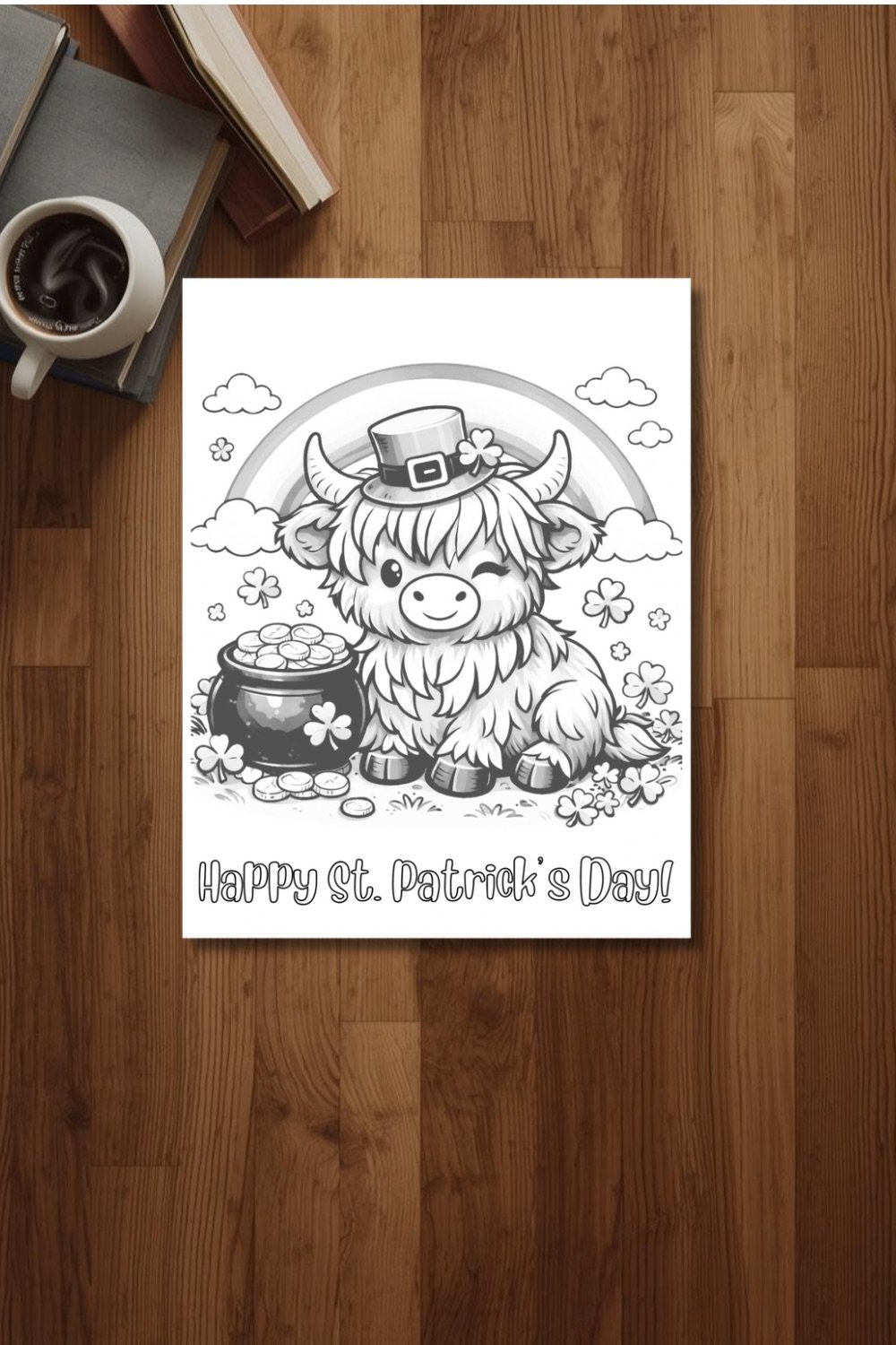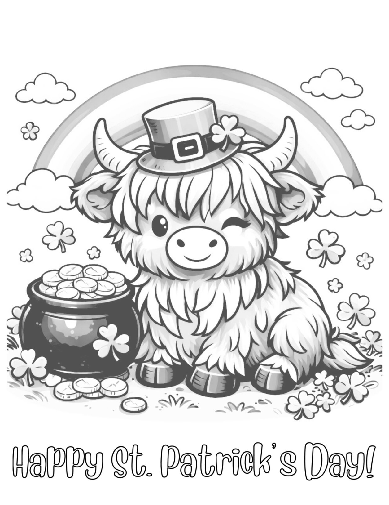 Celebrate St. Patrick’s Day with this adorable Highland cow! This whimsical, cozy cartoon-style design features a winking highland cow wearing a leprechaun hat, surrounded by shamrocks, a pot of gold, and a rainbow—perfect for kids and adults alike.