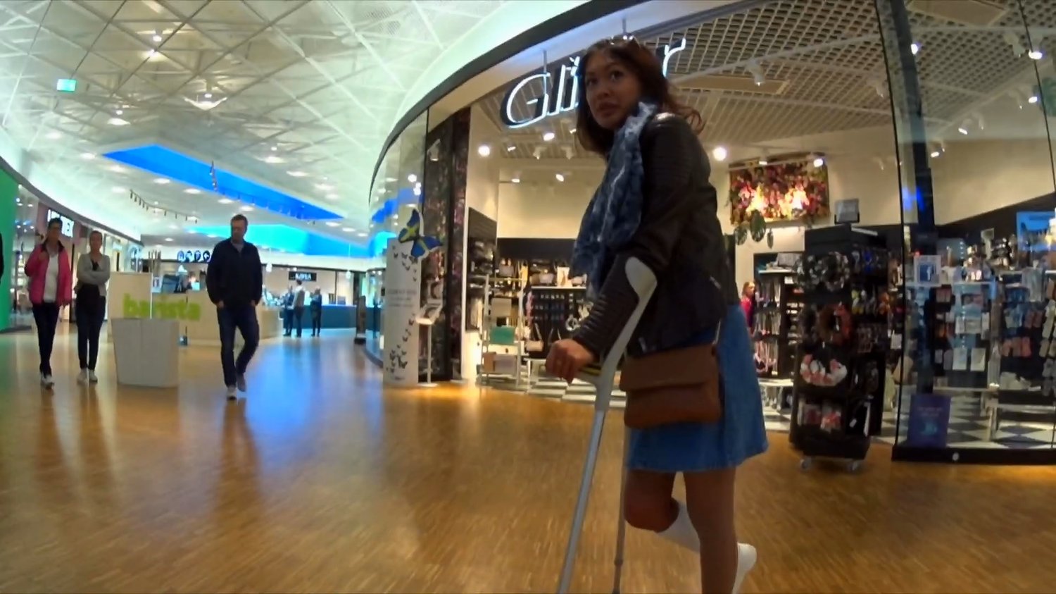 Bunny is crutching through a Mall and take the escaloter to the parked car.She has a white SLC on her right leg and in the next part we see her crutch to a water playground.We see her hopping around on one leg trying to pump water on at various stations before jumping back to her crutches and crutch back to the car.