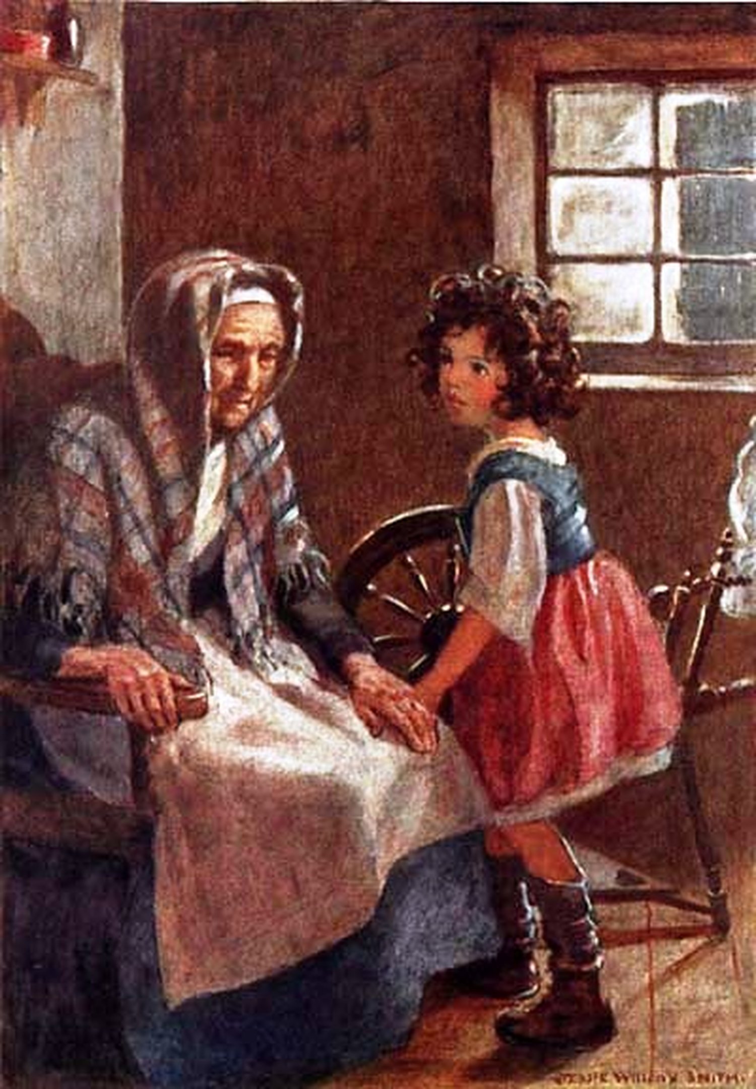In this tender illustration, young Heidi stands beside the blind grandmother, gently holding her hand in a cozy Alpine interior. The soft light from the window warms the rustic wooden room, while a spinning wheel and shawl-wrapped elder bring life to this iconic scene from Heidi. The brushwork and muted colors evoke a nostalgic, heartwarming moment of care and connection across generations.