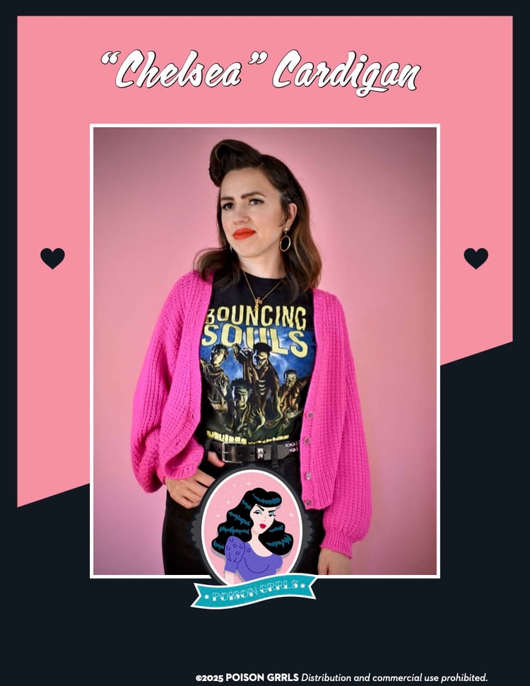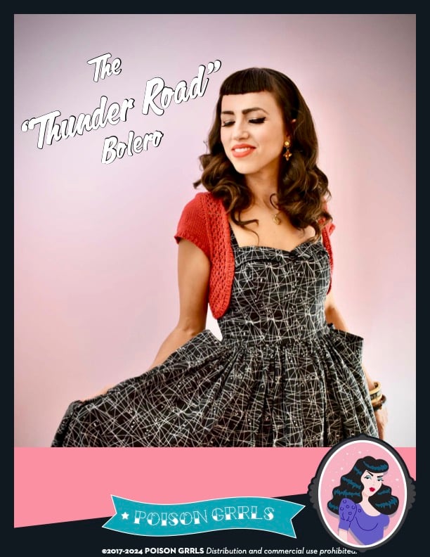 A bolero to wear with all your dresses, tiki sets, and rockabilly jumpsuits! The texture adds a sweet vintage vibe to any outfit, finished on the edges with seed stitch. Inspired by the great Queen of Rockabilly, Ms. Wanda Jackson.