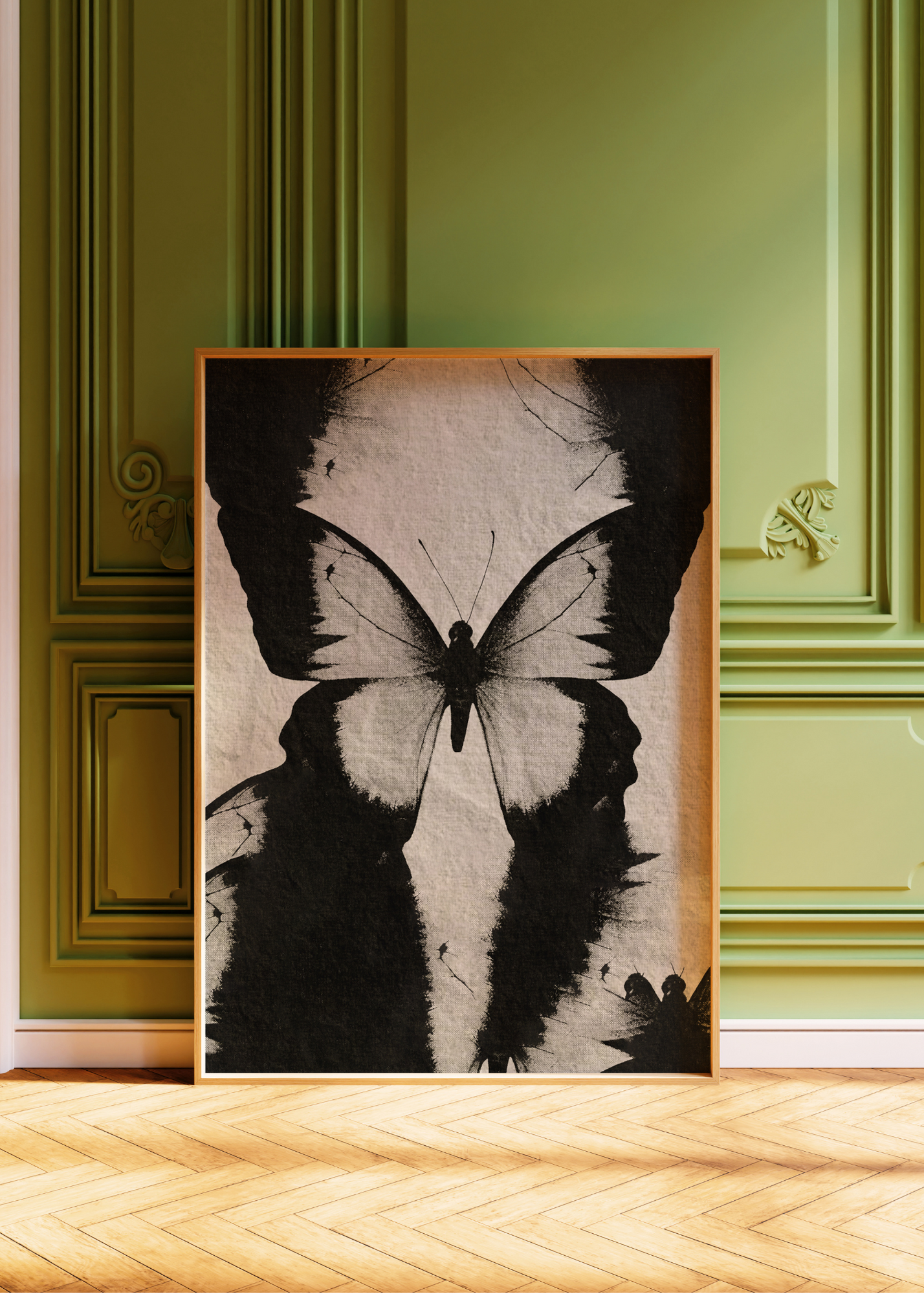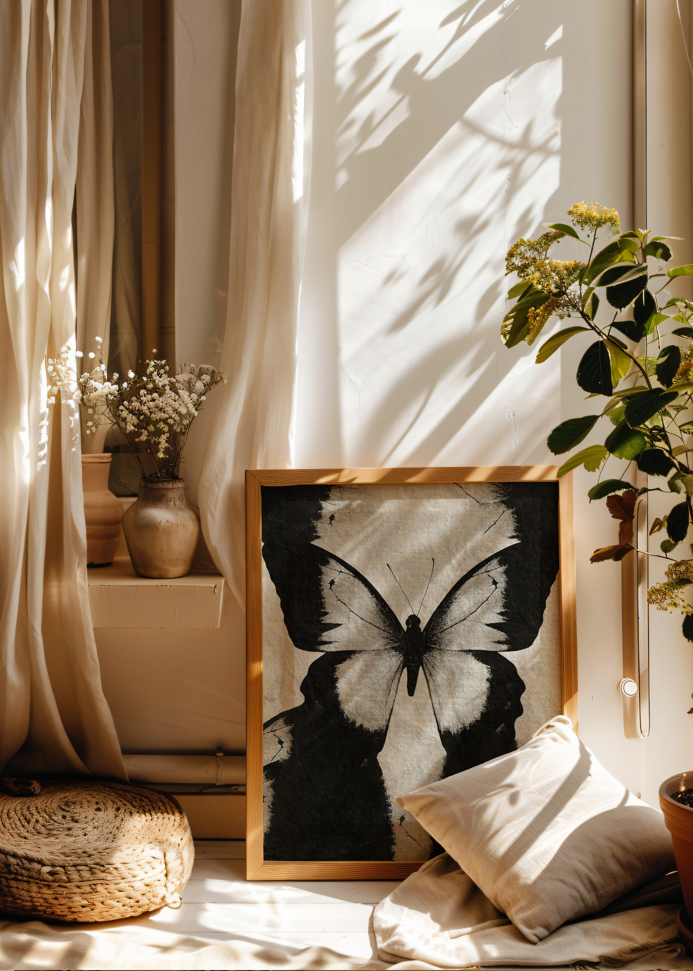 Ink and Wings— This striking monochrome piece balances elegance with just a hint of mystery. A mirrored butterfly rests at the center, surrounded by negative space and deep black brushstroke edges that blur like memory or smoke. It's thoughtful and slightly haunting in the best way—like the moment before transformation, captured in quiet stillness.