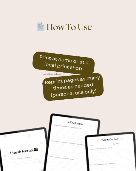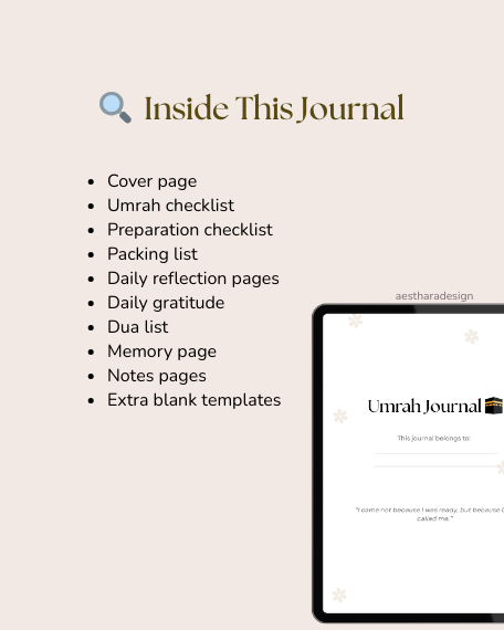 Whether this is your first Umrah or a returning journey, this journal guides you through reflection, planning, checklists, duas, gratitude, and travel notes — all in a printable and digital-friendly format.