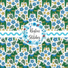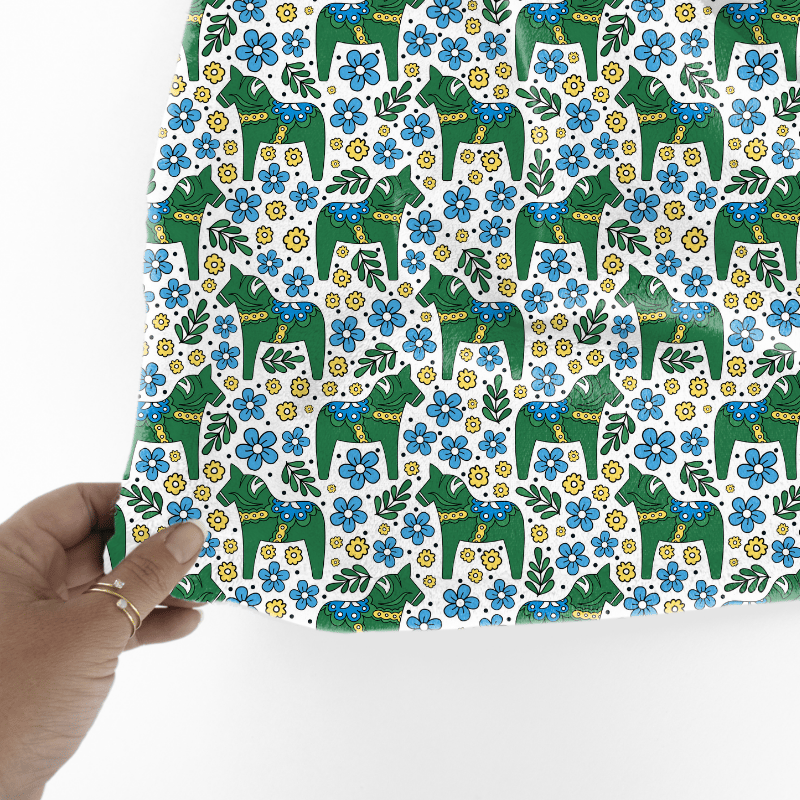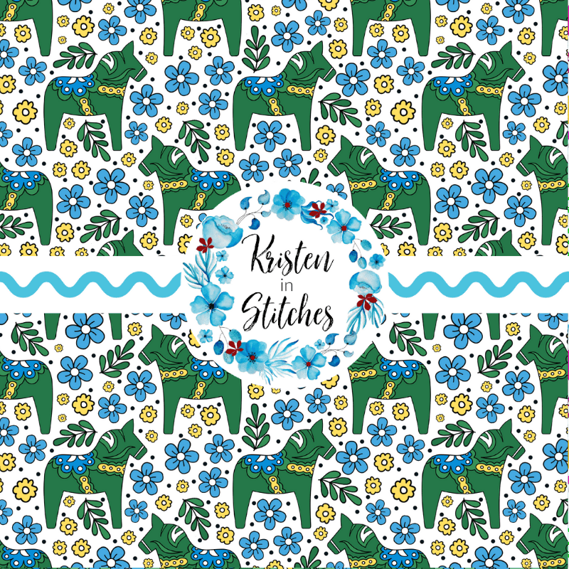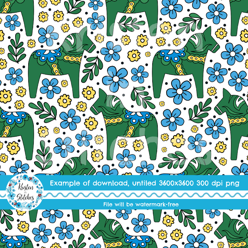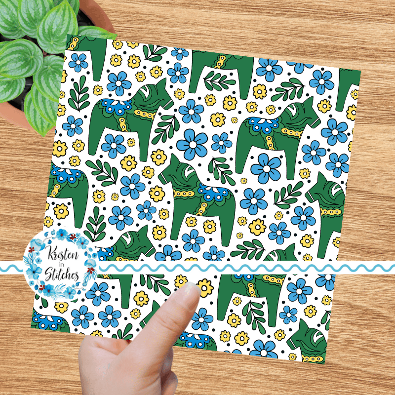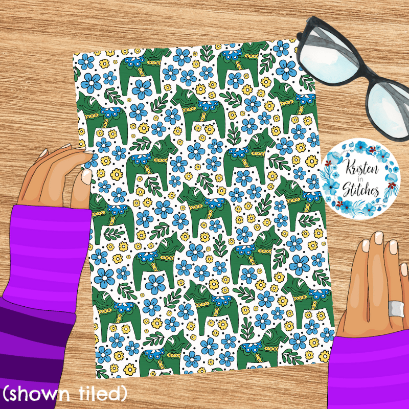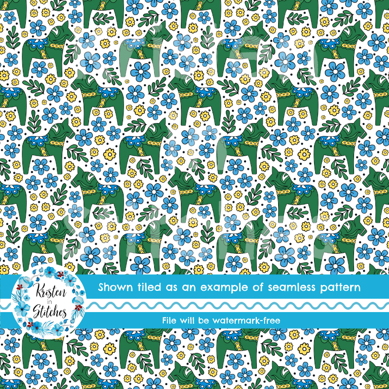 Dala Horse Scandinavian Folk Art Floral Seamless Pattern in Green and Blue