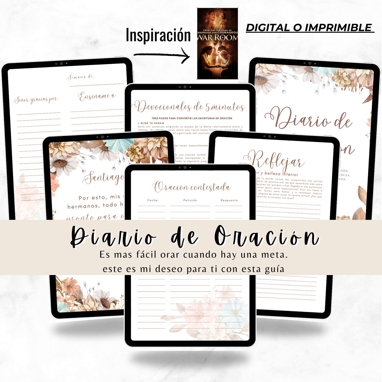 Diario de Oracion incluye: Devocional de 5 minutos, versículos de motivación para memorizar, reflexión, guía de oración, cosas en el corazón, peticiones, oraciones contestadas, y mas…