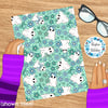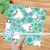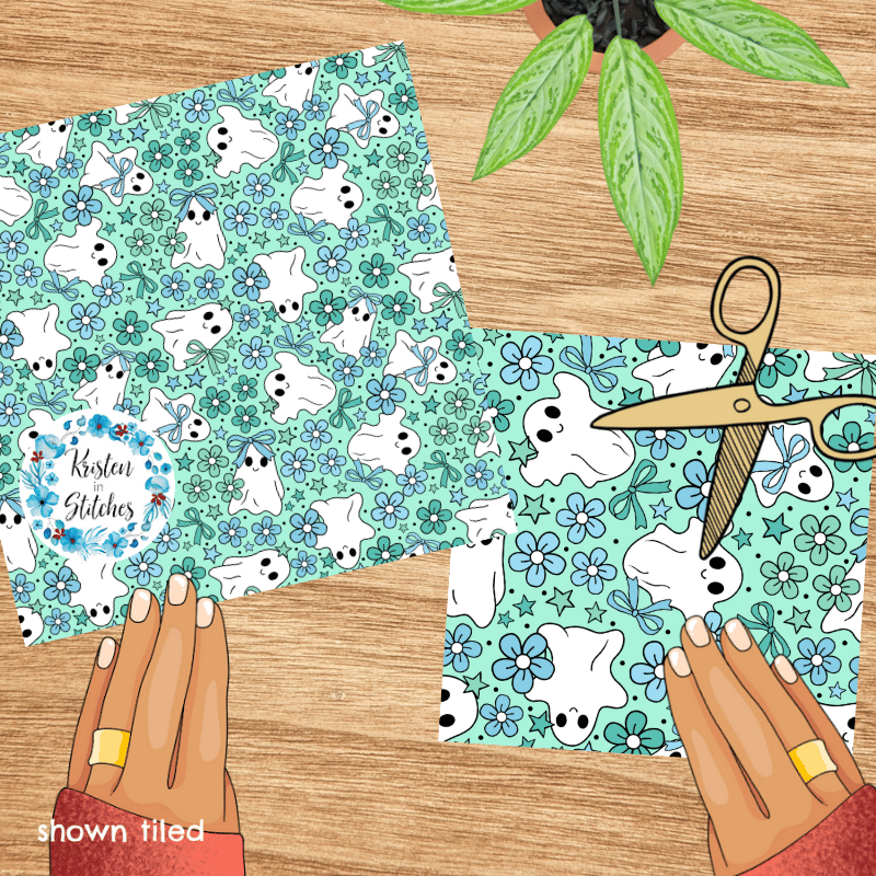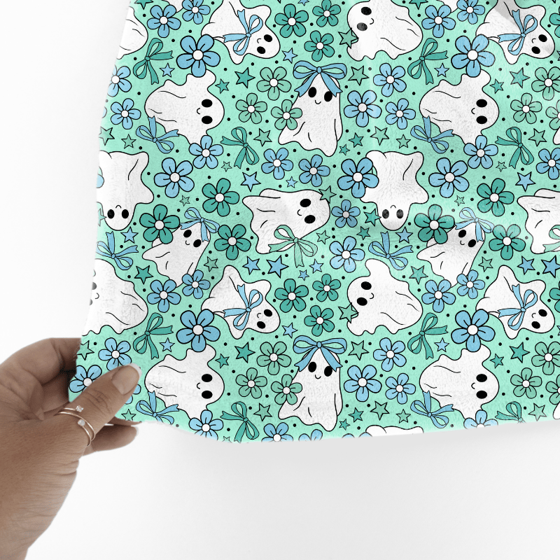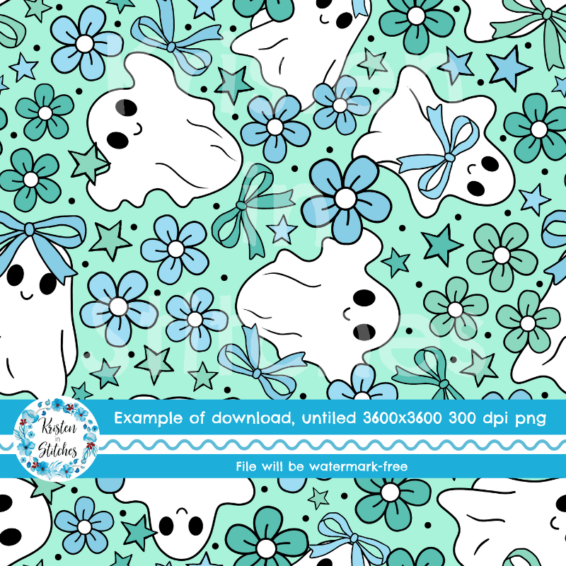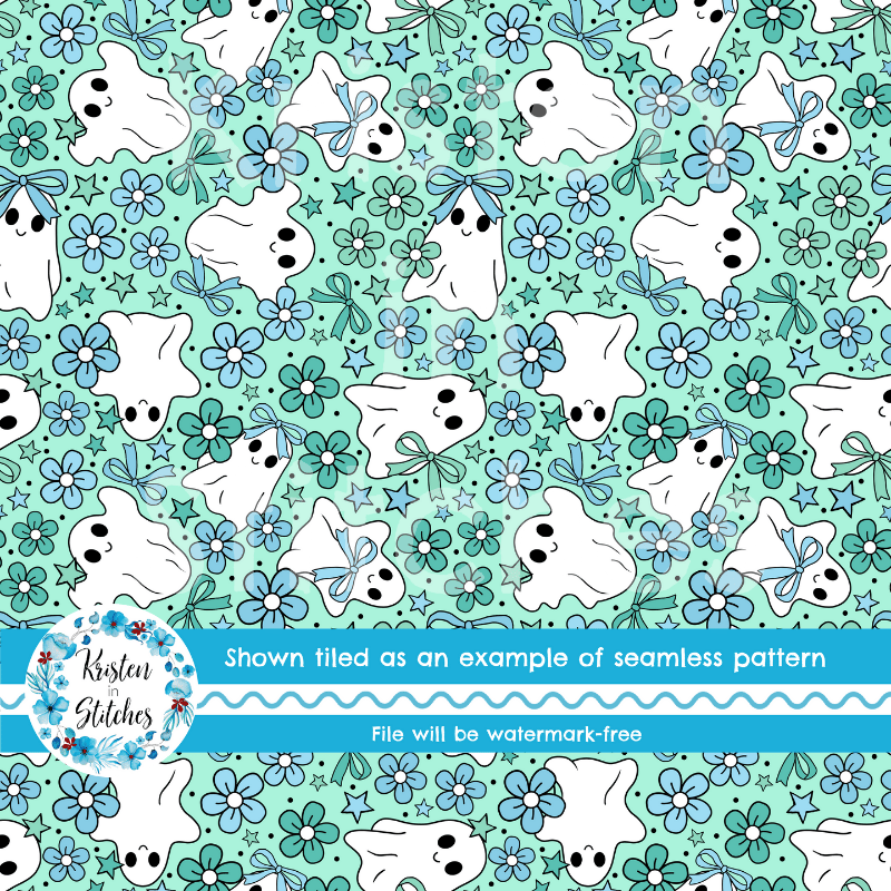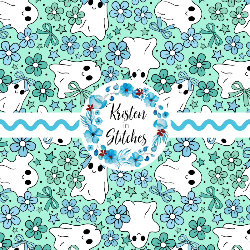 Friendly ghosts with ribbon bows and daisy flowers in mint green and blue.