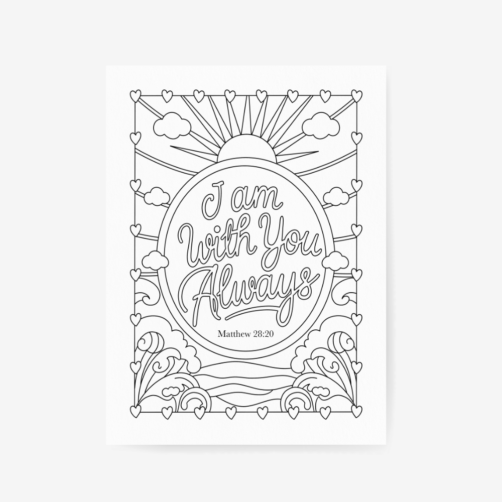 This coloring page highlights the bible verse Matthew 28:20 : "and teaching them to obey everything I have commanded you. And surely I am with you always, to the very end of the age."