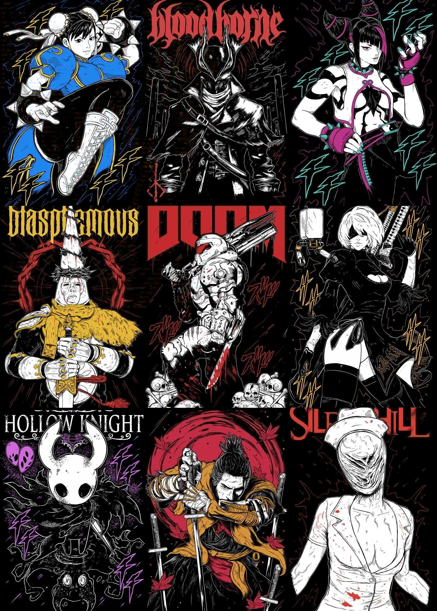 Diseño digital en alta resolución, inspirado en la fuerza, el estilo y la oscuridad de los personajes más icónicos de Videojuegos: Chun Li, Bloodbourne, Juri, Blasphemous, Doom, 2B, Hollow Knight, Sekiro, Nurse.