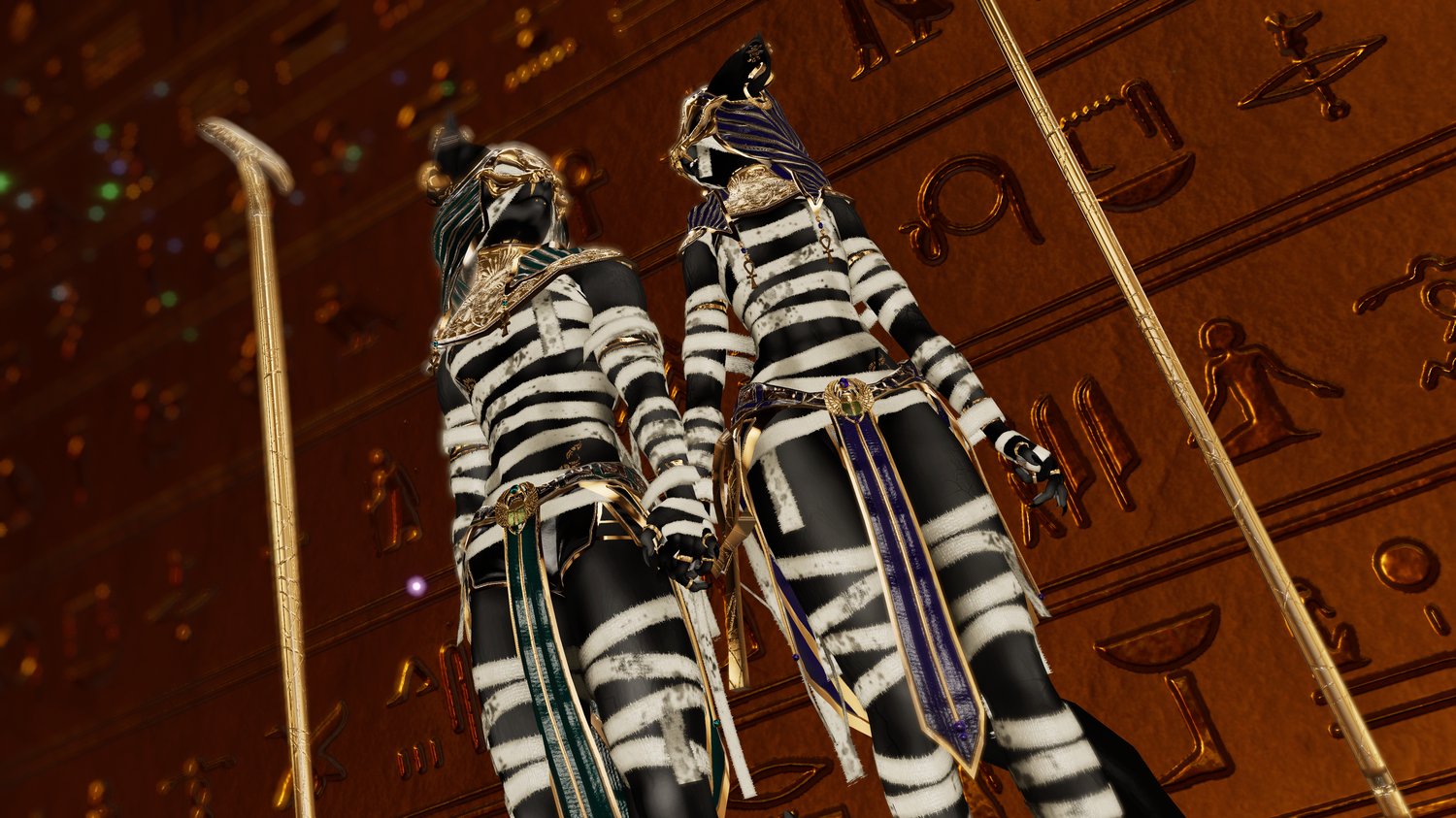 All bandages, hair, the skirt, mask, collar, hood, pants/panties, jewelry, earrings, piercings, rings, ankh, Sistrum, Was scepter, heart, heart particles, tail and all the textures to it are made from scratch by me in Blender and Substance Painter.