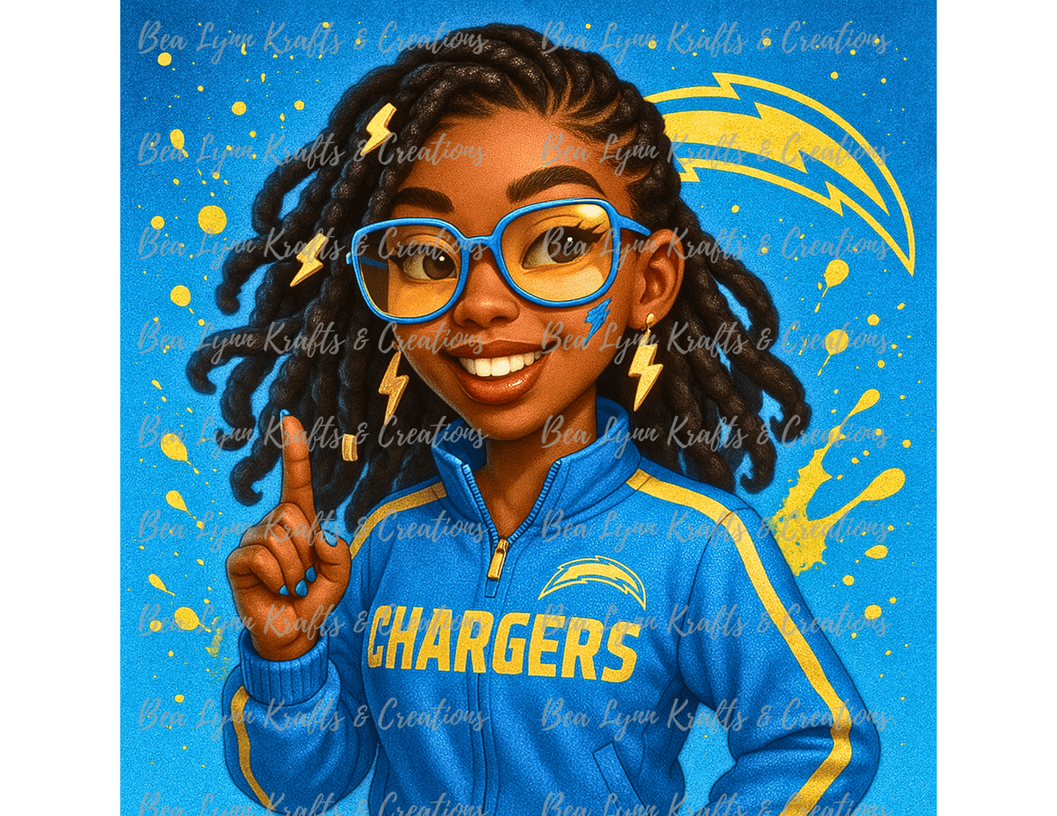 Electrify your next creation with this energetic Los Angeles Chargers cartoon PNG! Featuring a smiling girl fan styled in a bold Chargers tracksuit, lightning bolt face paint, matching glasses, and electrifying earrings, this PNG captures the spirit of game day with a spark. The vivid blue and yellow splatter background brings action and style—perfect for designing standout merch, sublimation products, or sports-themed party supplies.