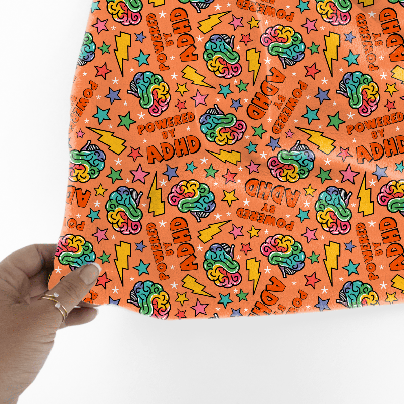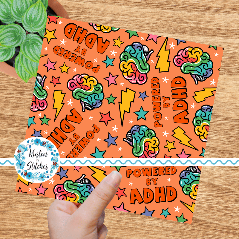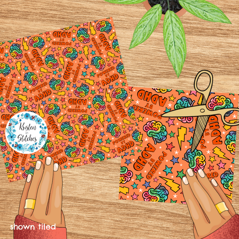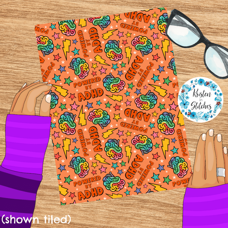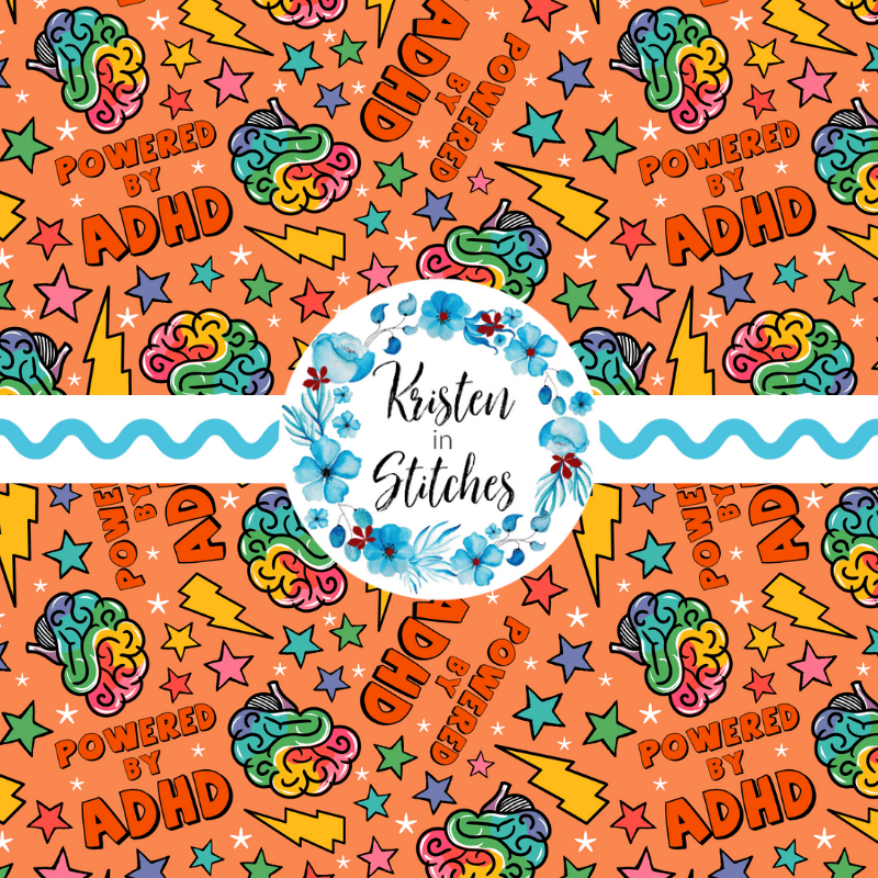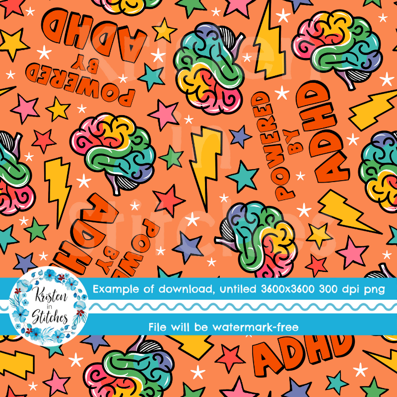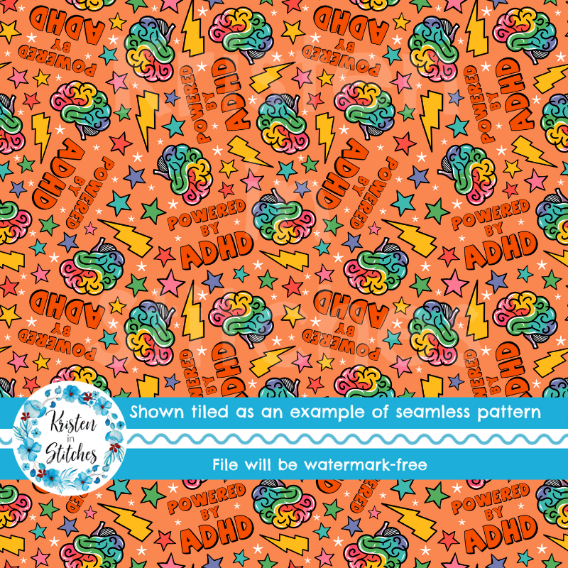 Powered by ADHD Seamless Pattern, Neurodivergent Rainbow Brains, Orange