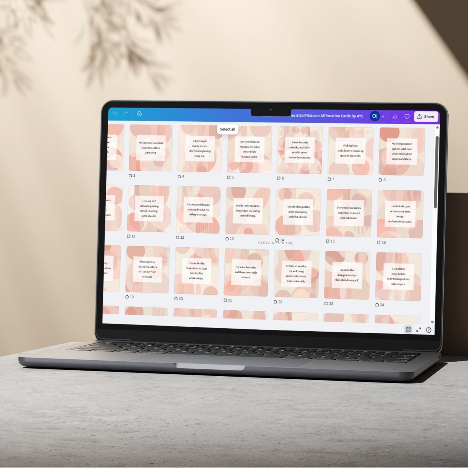 1. Canva link to the editable Boundaries & Self-esteem affirmation cards template (60 cards).