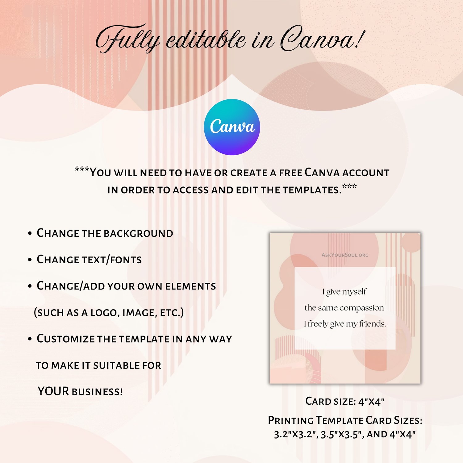 With this purchase, you will get access to editable Canva templates for commercial and personal use, allowing you to tailor the affirmations to YOUR needs, plus a template for printing your own version of the cards.