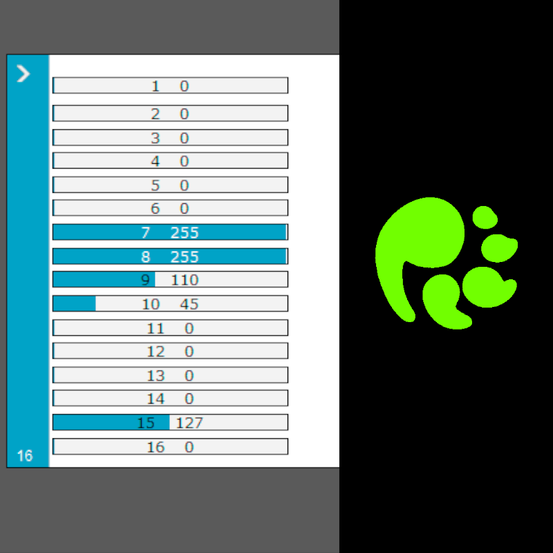 * Verifique que coincidan estos canales: 8 Dimmer, 7 Strobo / Shutter, 9 en el valor 110 = Verde Claro, 10 en el valor 45 = Gobo de Huella, 15 Foco (ver tercer foto).