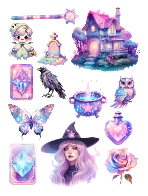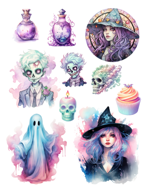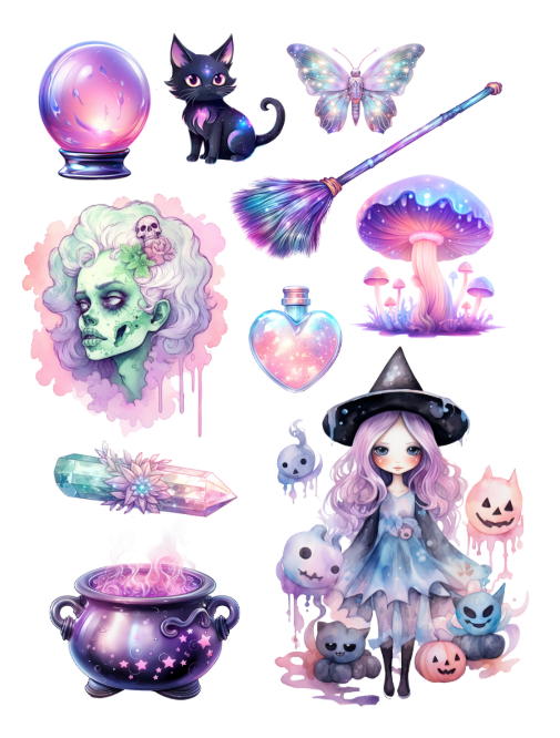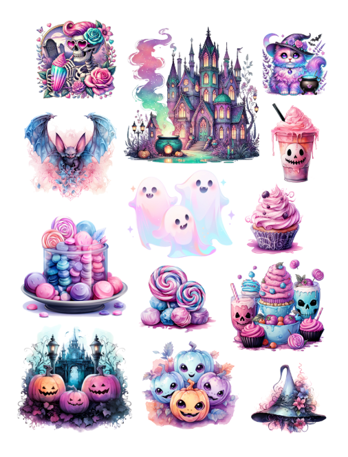 Pull out your scissors and glue and dive into the magical world of pastels at Halloween time featuring witches, cauldrons, brooms, pumpkins, ghosts, goblins, candies and cakes, spooky haunted houses, spiders, potions and notions, cats, mushrooms, crystal balls, cupcakes, candles, ravens, owls, roses, and more with this artistically beautiful clip art cut and collage book.
