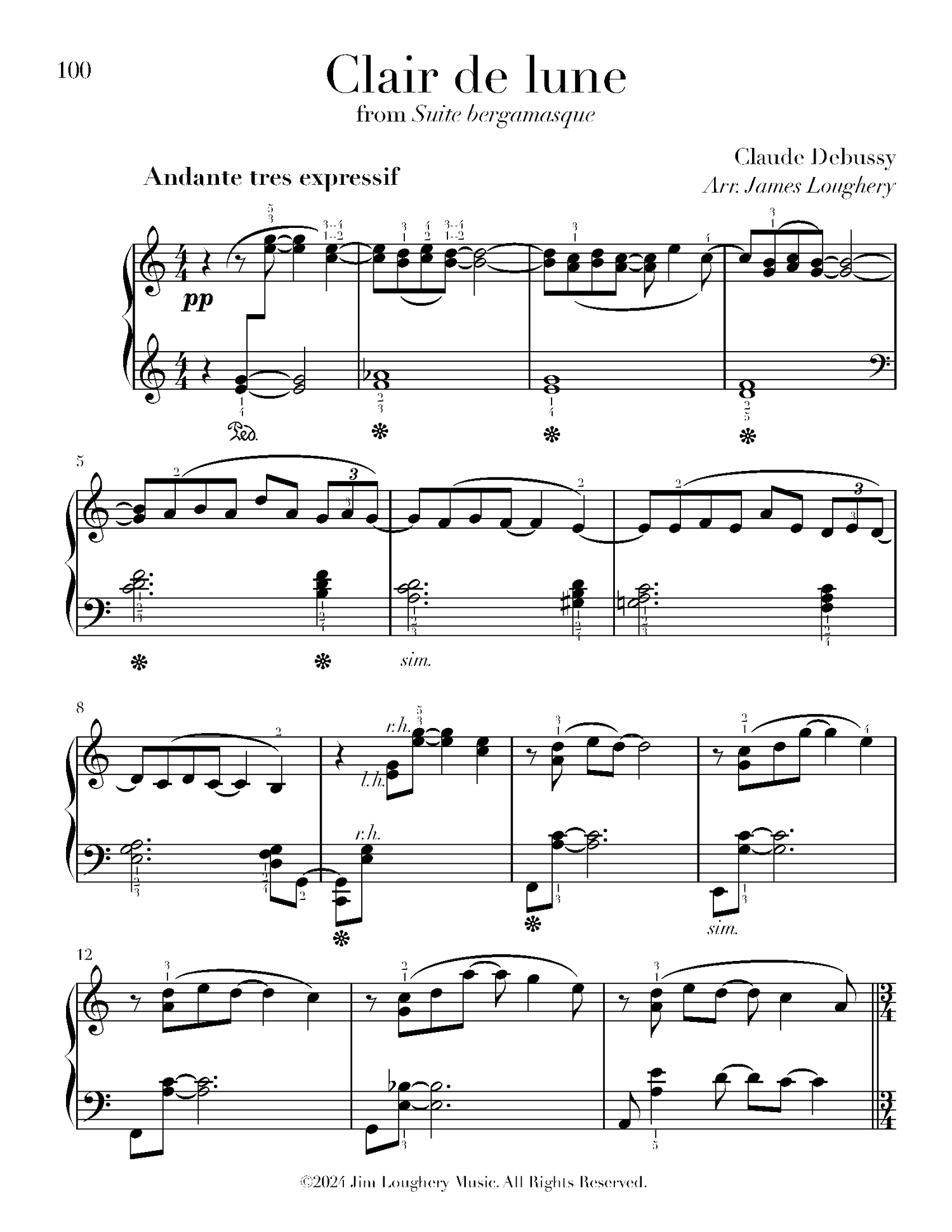 From the Jim's Gems book series, a unique collection of treasured masterpieces from the Baroque to the 20th Century exquisitely arranged for early to late intermediate piano by Jim Loughery. Featuring cherished and rare works by Bach, Mozart, Beethoven, Chopin, Brahms, Liszt, Debussy, Satie, Joplin, Gershwin, and more!