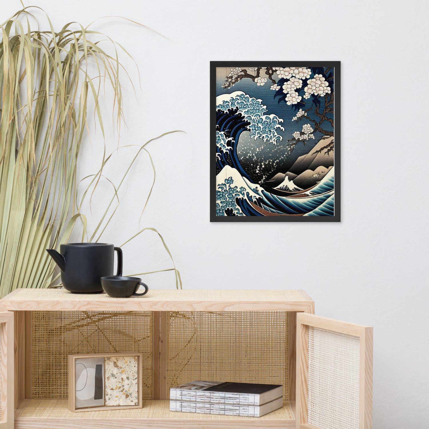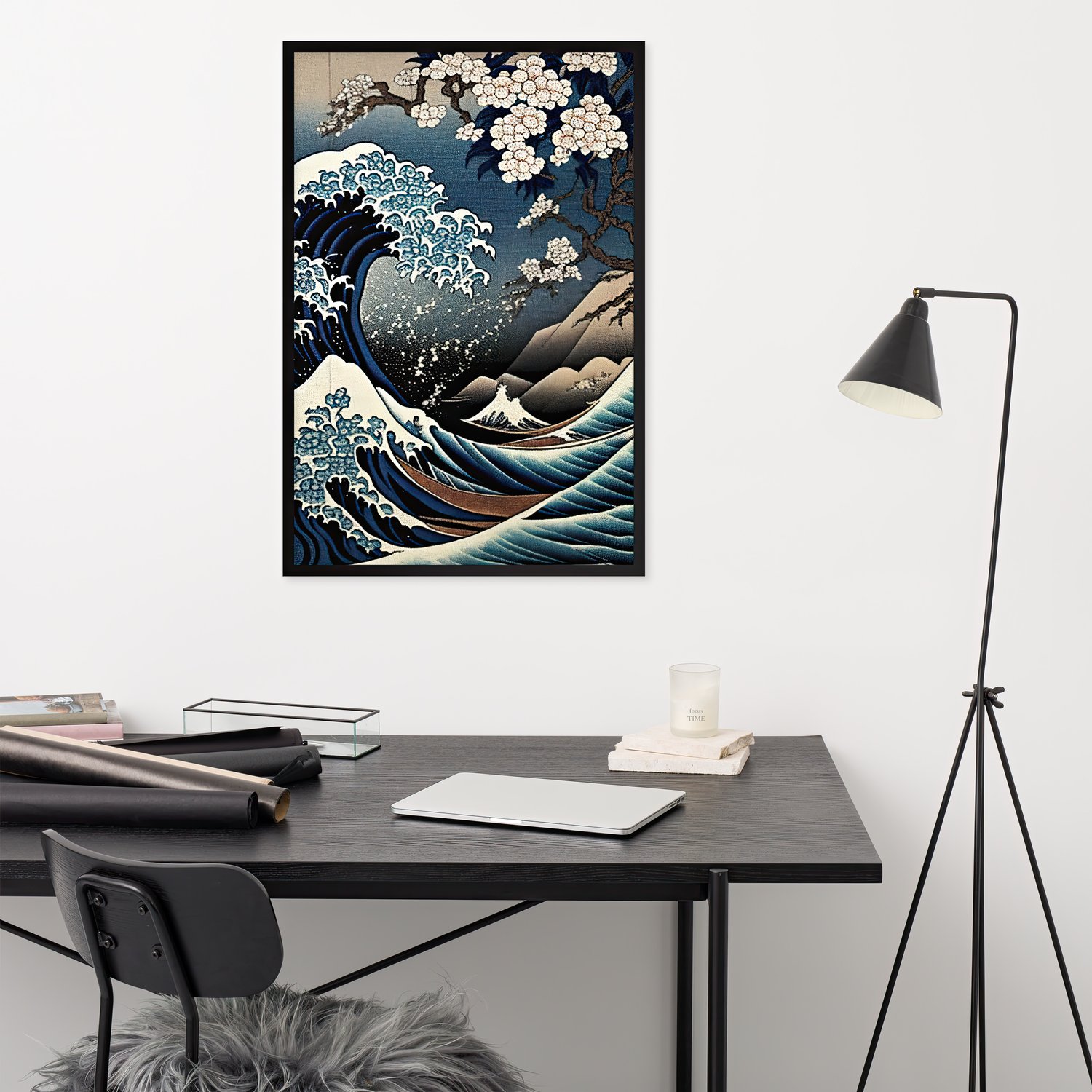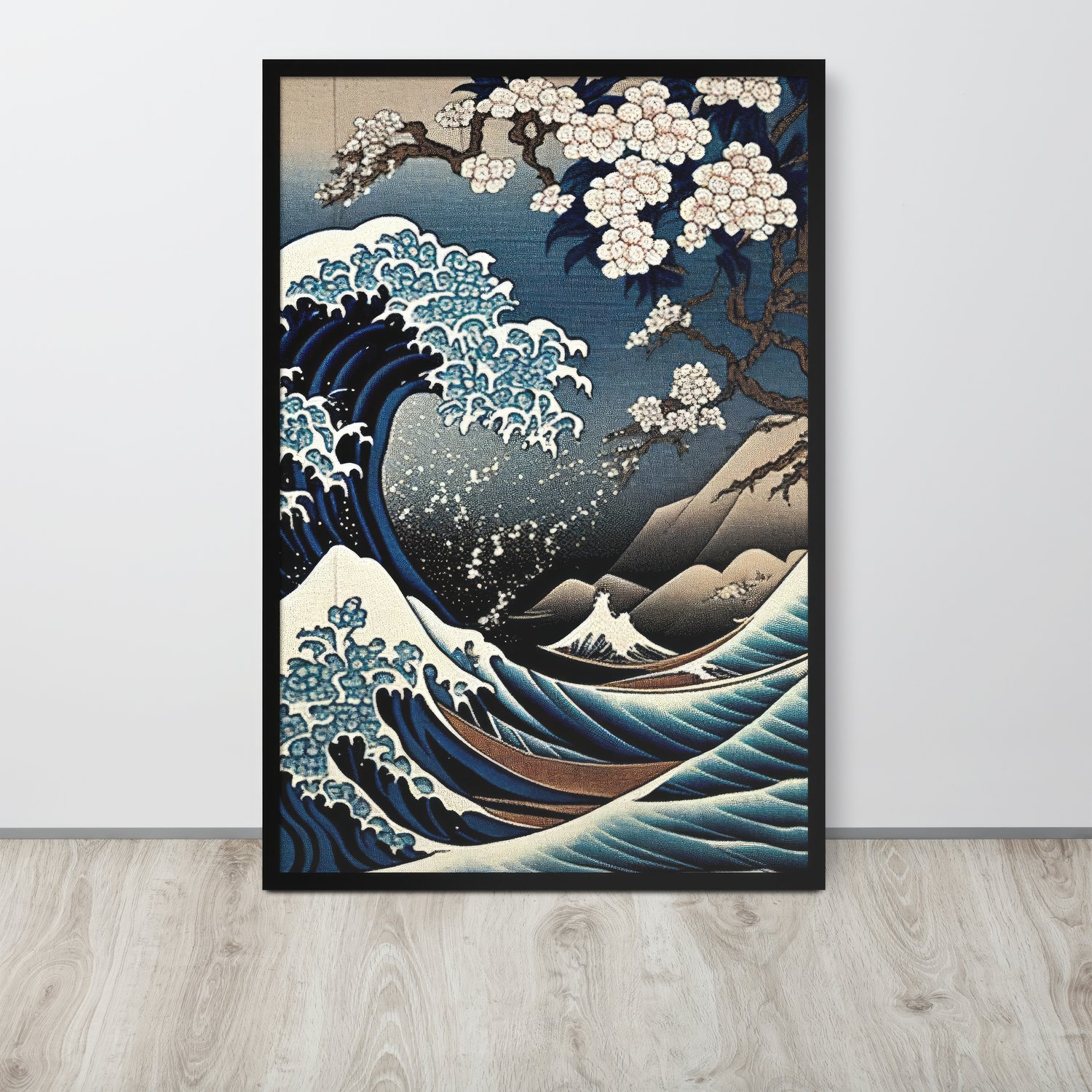 The Tsunami Blossom is a beautiful traditional Japanese-style illustration featuring huge waves crashing in the ocean, with boats still hanging out in the water. Mountains can be seen in the background, while a Sakura tree is depicted in the foreground, adding a touch of serenity and beauty to the piece. This high-quality digital file is perfect for those who want to display this stunning artwork in their homes or offices and allows for the flexibility of printing on a variety of materials and sizes.