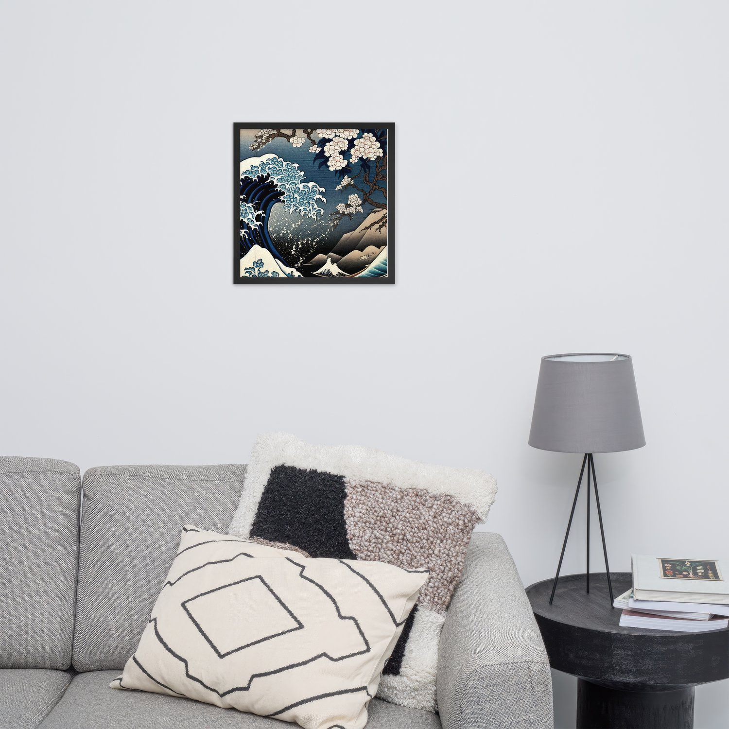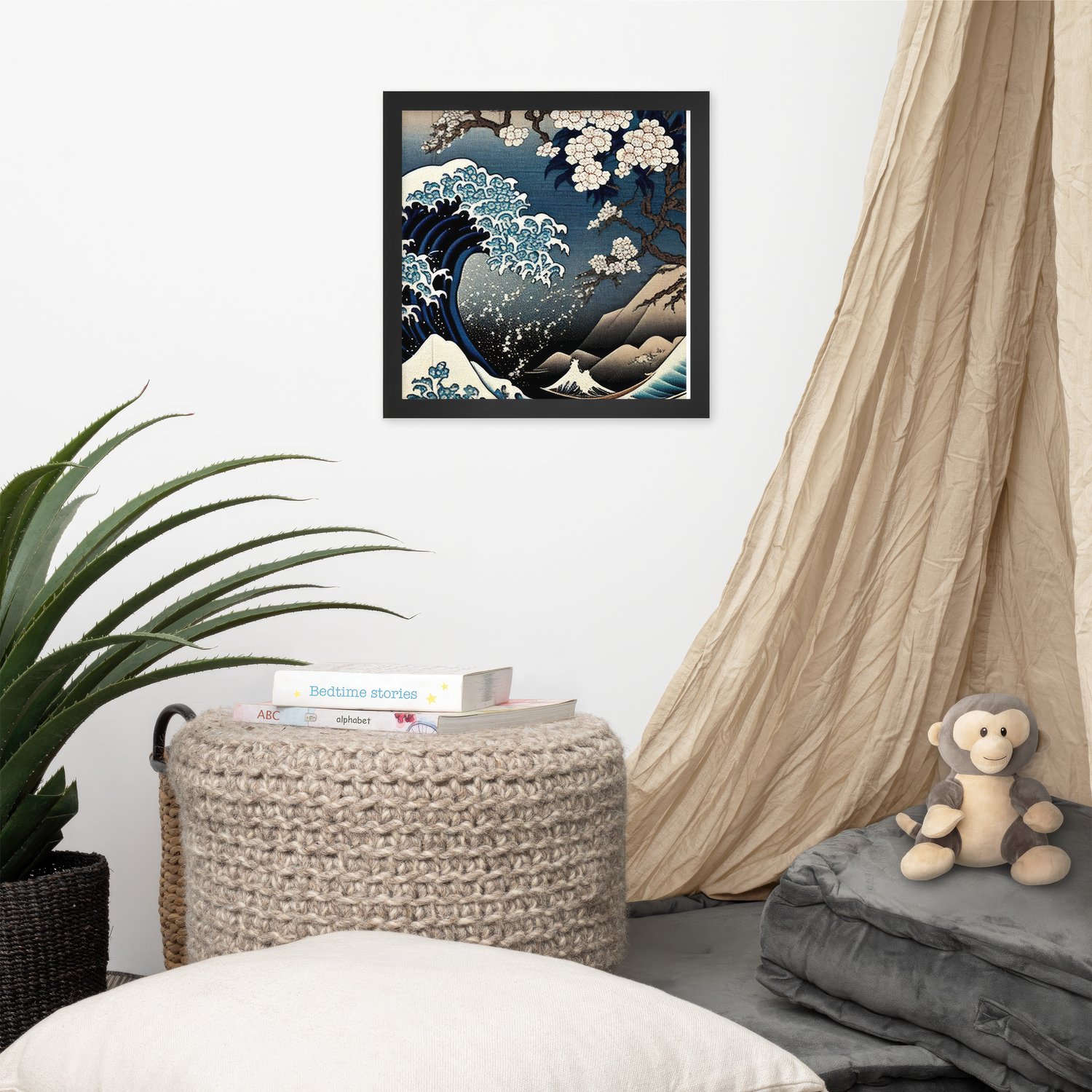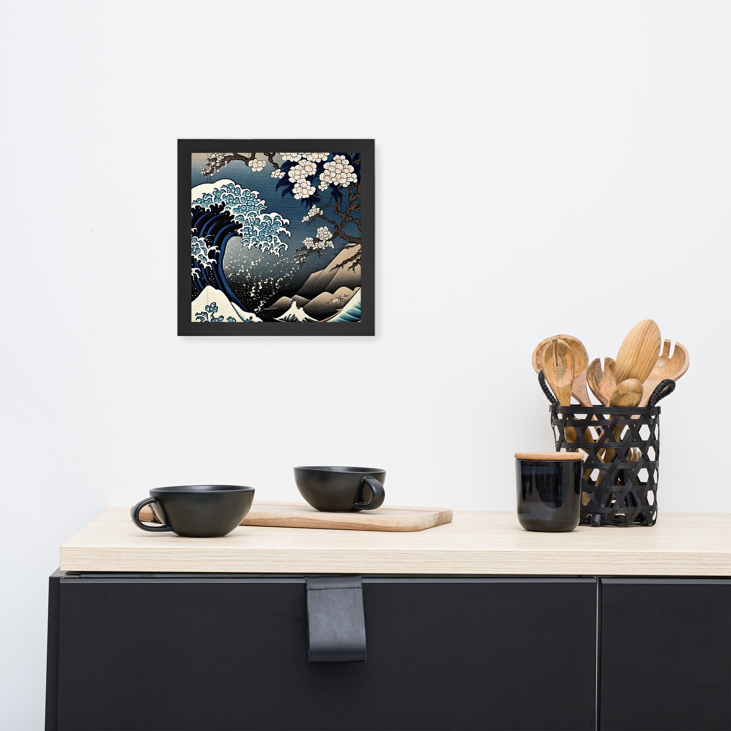 The Tsunami Blossom is a beautiful traditional Japanese-style illustration featuring huge waves crashing in the ocean, with boats still hanging out in the water. Mountains can be seen in the background, while a Sakura tree is depicted in the foreground, adding a touch of serenity and beauty to the piece. This high-quality digital file is perfect for those who want to display this stunning artwork in their homes or offices and allows for the flexibility of printing on a variety of materials and sizes.