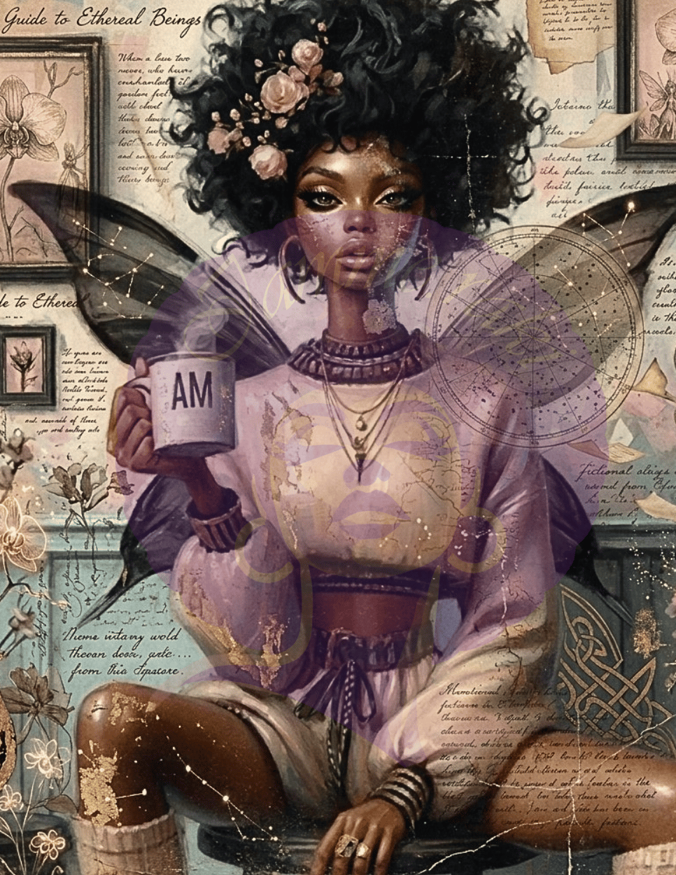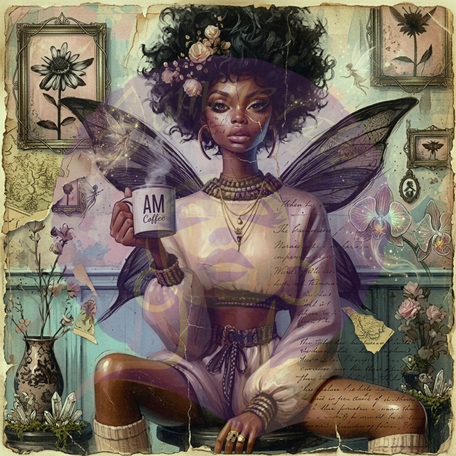 This piece blends Afrocentric beauty with dark romanticism, layered in vintage textures and soft gothic detail.