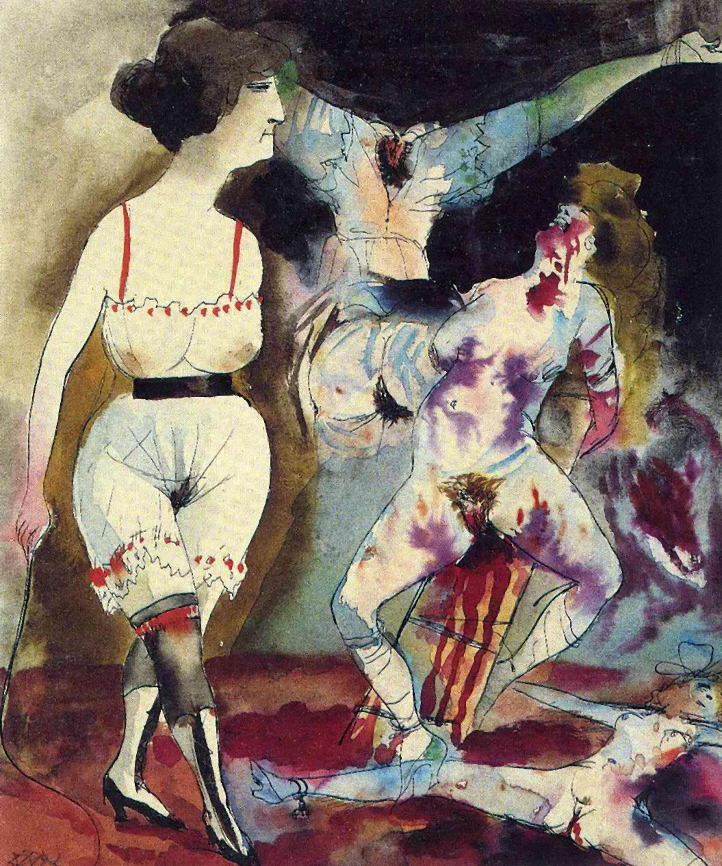 In 1914, Otto Dix went volunteer to the front. These are documentary evidence, carried out directly "in flagrante", on the site of events. It was these materials that formed the basis of his striking graphic cycle "War", which was published in Berlin in 1924 by Karl Niirendorf. These works, executed in the style of expressionism, well convey the artist's understanding of what happened in the world, the war is depicted not so much as a concrete social action, but as a terrible element, cataclysm, and fuss. This graphic cycle of Dix was shocking to the public. His expressionism was really expressive, his works were screaming in pain.