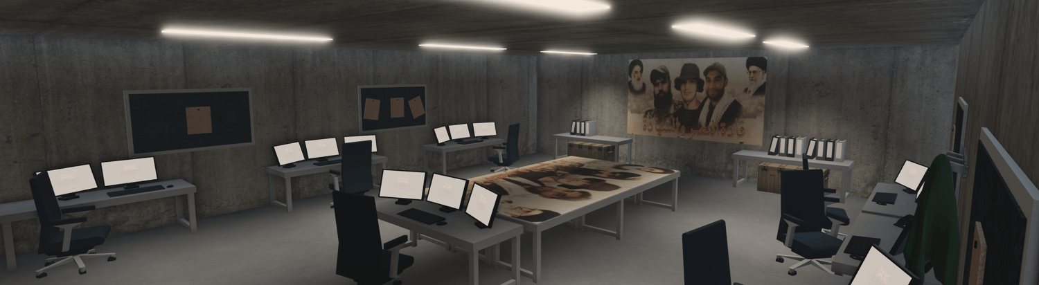 - Interior operations room with workstations, monitors, chairs, lighting fixtures, wall boards, and storage areas