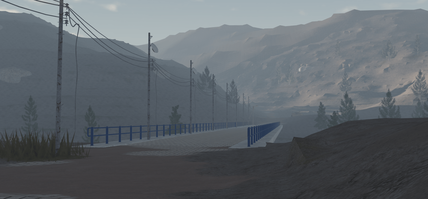 - Bridge crossing with railings and power poles set in a foggy valley corridor